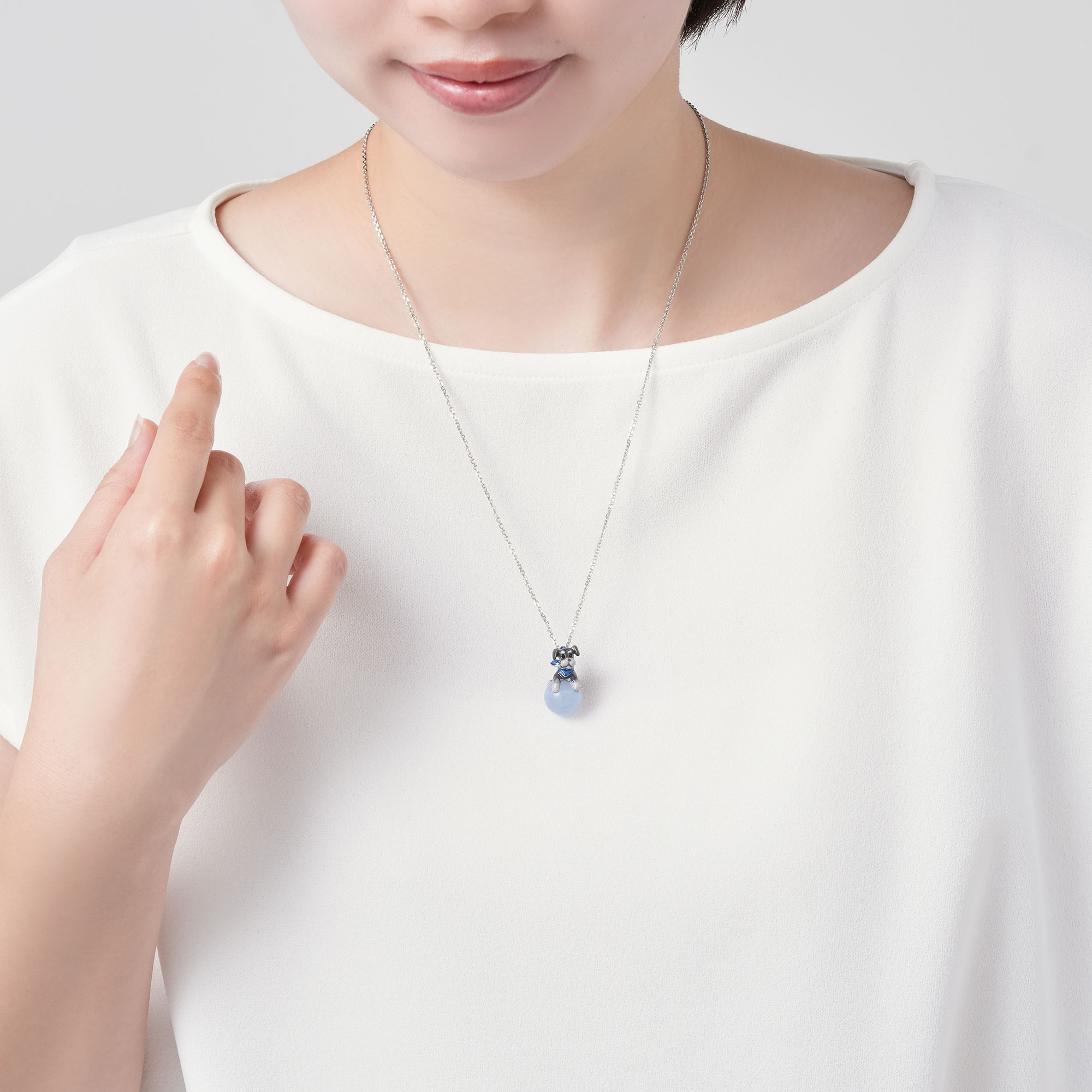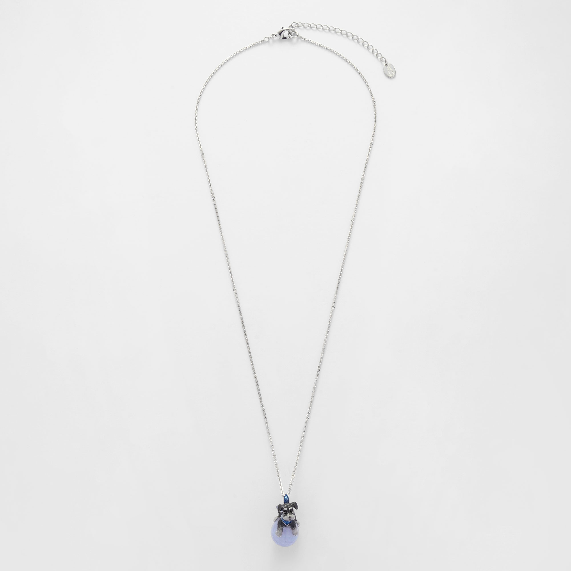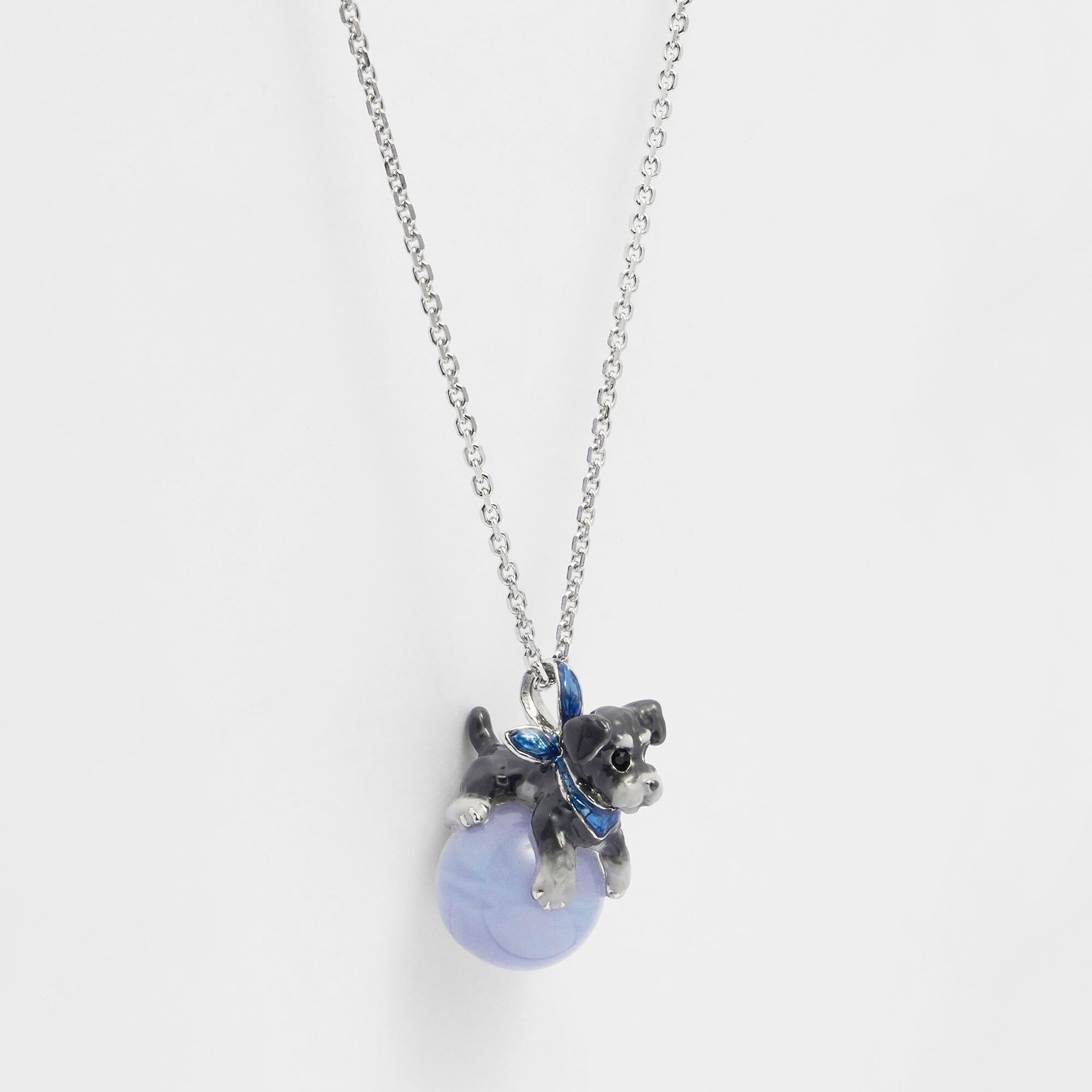 ドイツ・シュニール織のブランド「FEILER(フェイラー)」とのコラボレーションアイテム。様々な種類の犬たちを愛らしく描いたヴァンドームブティックオリジナルのフェイラー製ハンカチと、オリジナリティー溢れるアクセサリーとのスペシャルなセットです。長く立派な口ひげと愛嬌たっぷりの眉毛がチャームポイントのミニチュア・シュナウザー。明るく好奇心旺盛で遊ぶのが大好きな性格を、そのままネックレスで表現しました。ブルーレースアゲートの石をボールに見立て、ちょこんとお座りする姿がとってもキュート。熟練した職人によって一つ一つ手作業で描かれたグレイッシュなカラーは、上品なソルト&ペッパー。ニュアンスある石のブルーカラーに、スカーフのロイヤルブルーがマッチし、ノーブルな印象に。クールなカラーリングは、スタイリングを選ばずコーディネートの幅が広がります。ブルーレースアゲートは優しい空色を持つことから「深い癒し」の力があると言われています。大切な方へのギフトにもぴったりです。 ▼ FEILER Collection <LOVELY DOGS Vol.01> はこちらhttps://vendome.jp/vendome_boutique/feature/boutique_feiler2 ▼ FEILER Collection <LOVELY DOGS Vol.02> はこちらhttps://vendome.jp/vendome_boutique/feature/boutique_feiler3 ▼ FEILER Collection <PLAYING CATS> はこちらhttps://vendome.jp/vendome_boutique/feature/boutique_feiler
