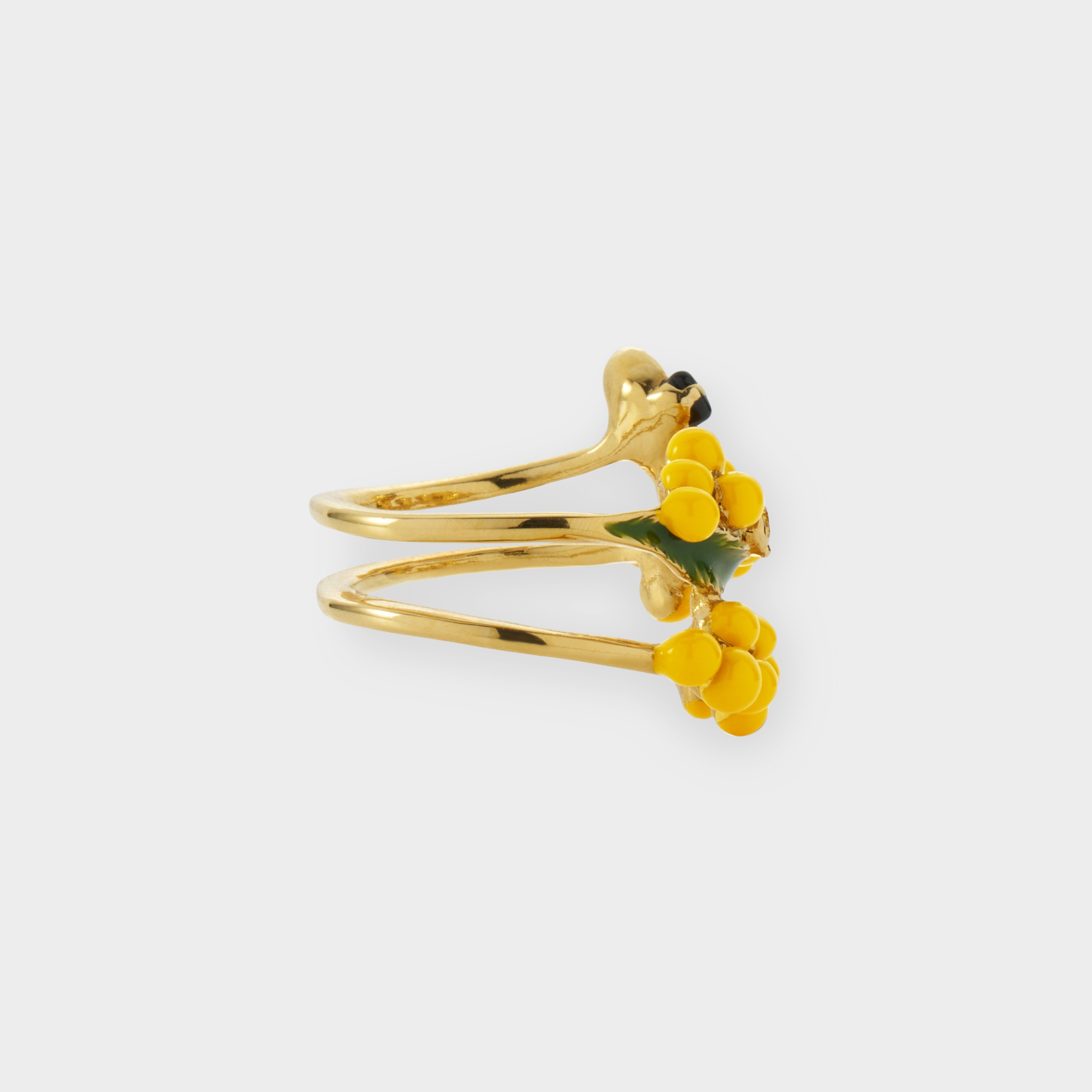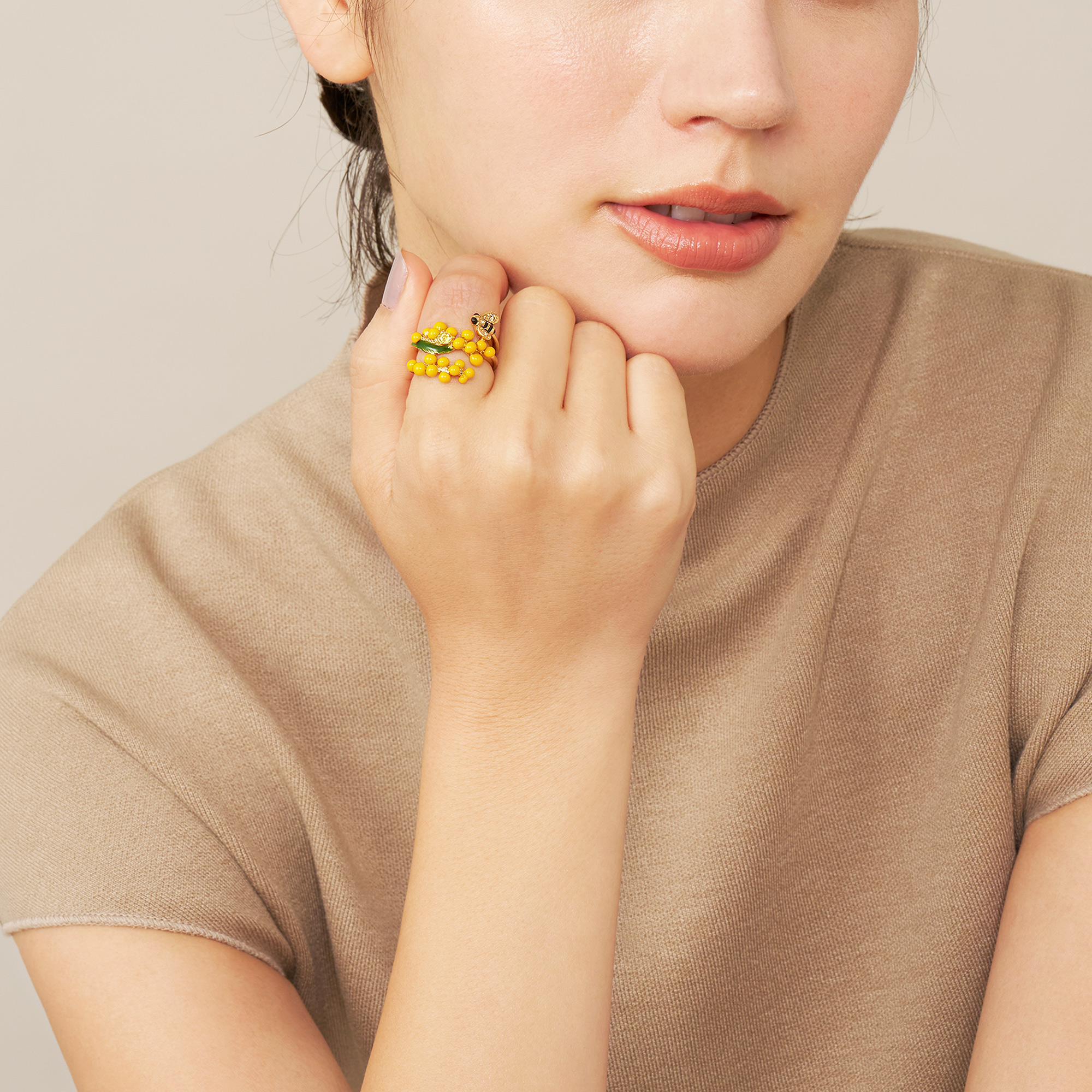 瑞々しいミモザの繊細な花に、ぷっくりとしたミツバチの立体感が愛らしいアクセントをプラス。