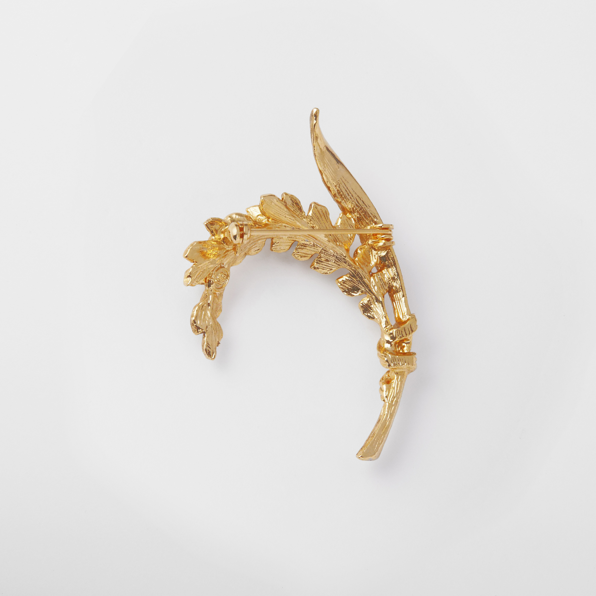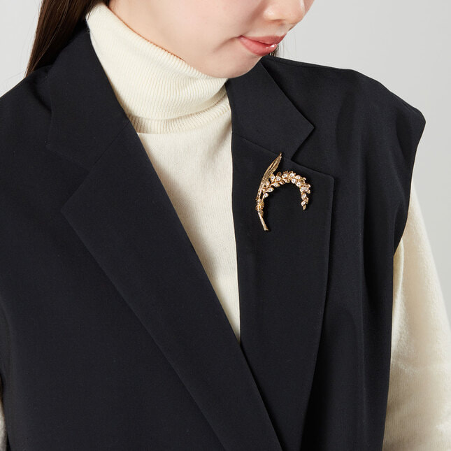弧を描く美しいフォルムに加え、細かいテクスチャーとカットガラスの輝きがクラシカルで、胸元に添えるだけでエレガントな印象を与えます。