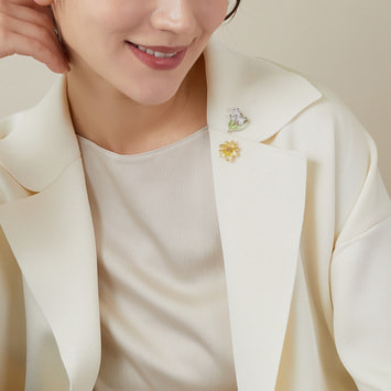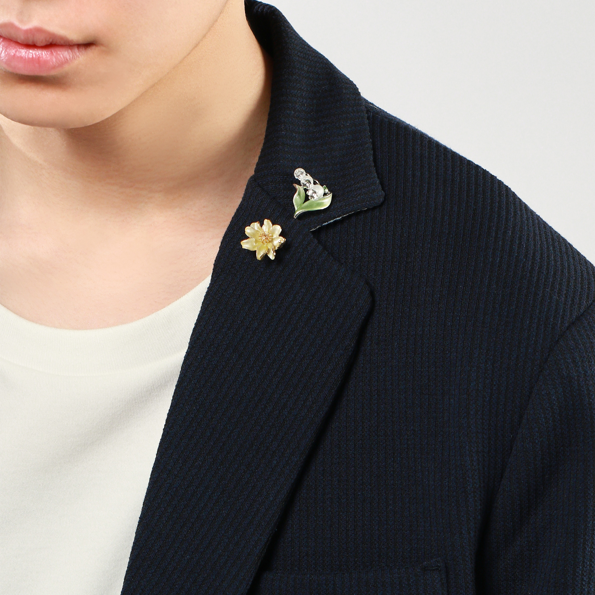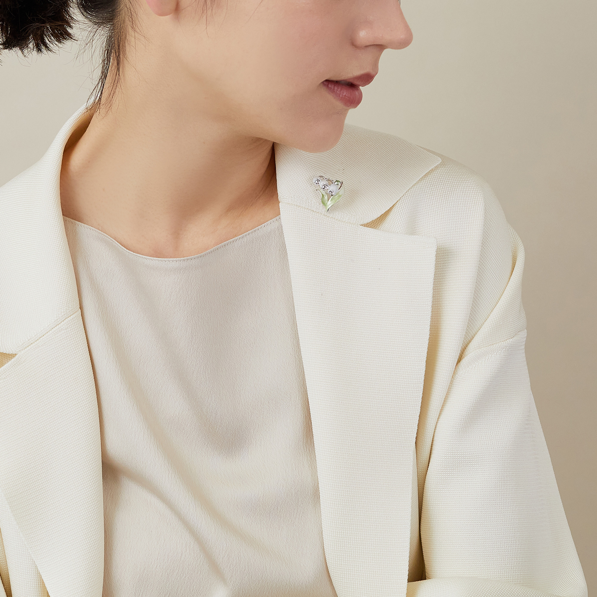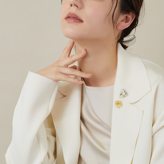 柔らかなバターイエローが鮮やかなマーガレットと、エレガントさとキュートさを兼ね備えた凛とした美しさが魅力のすずらんのブローチを重ねづけして、品よくスタイリングのポイントに。