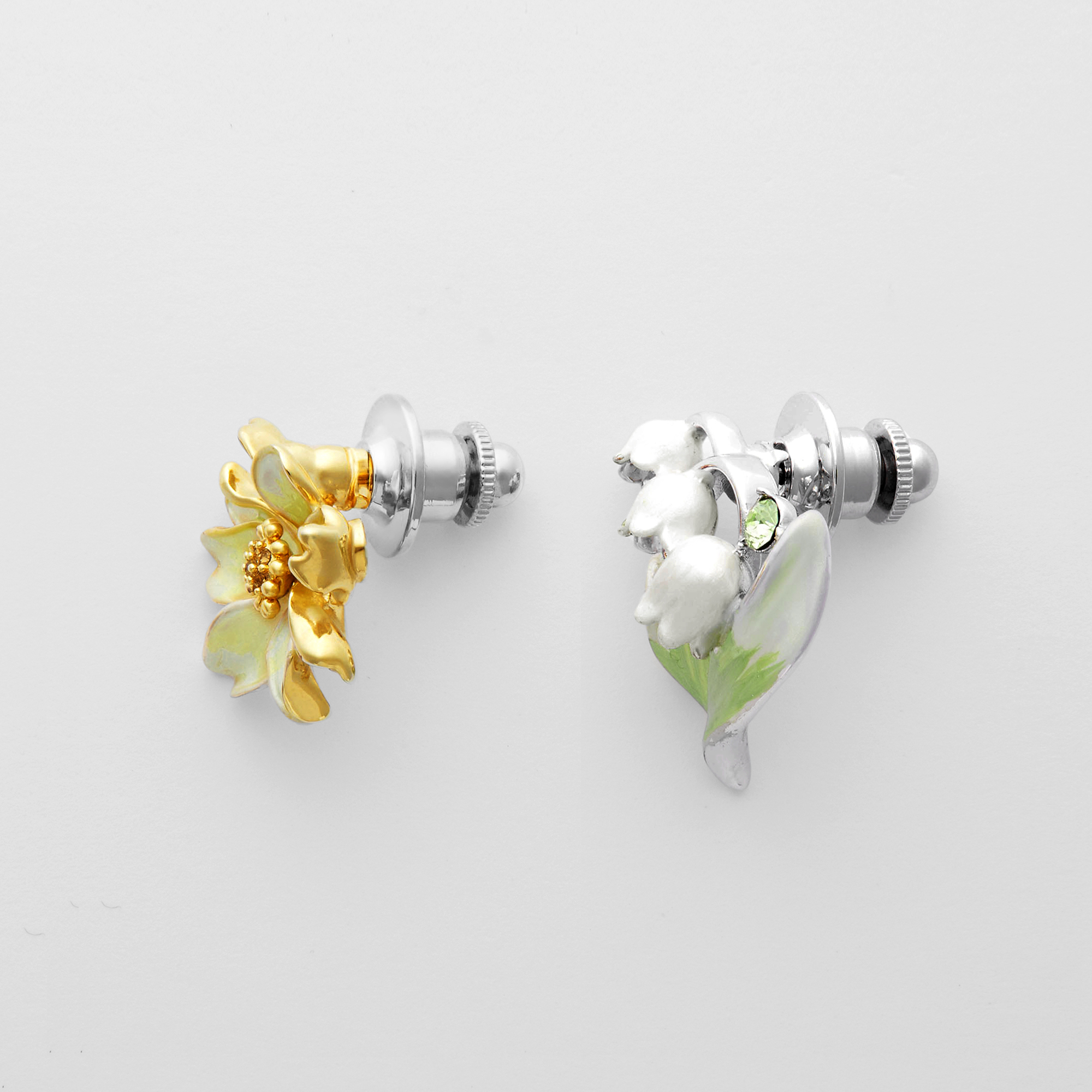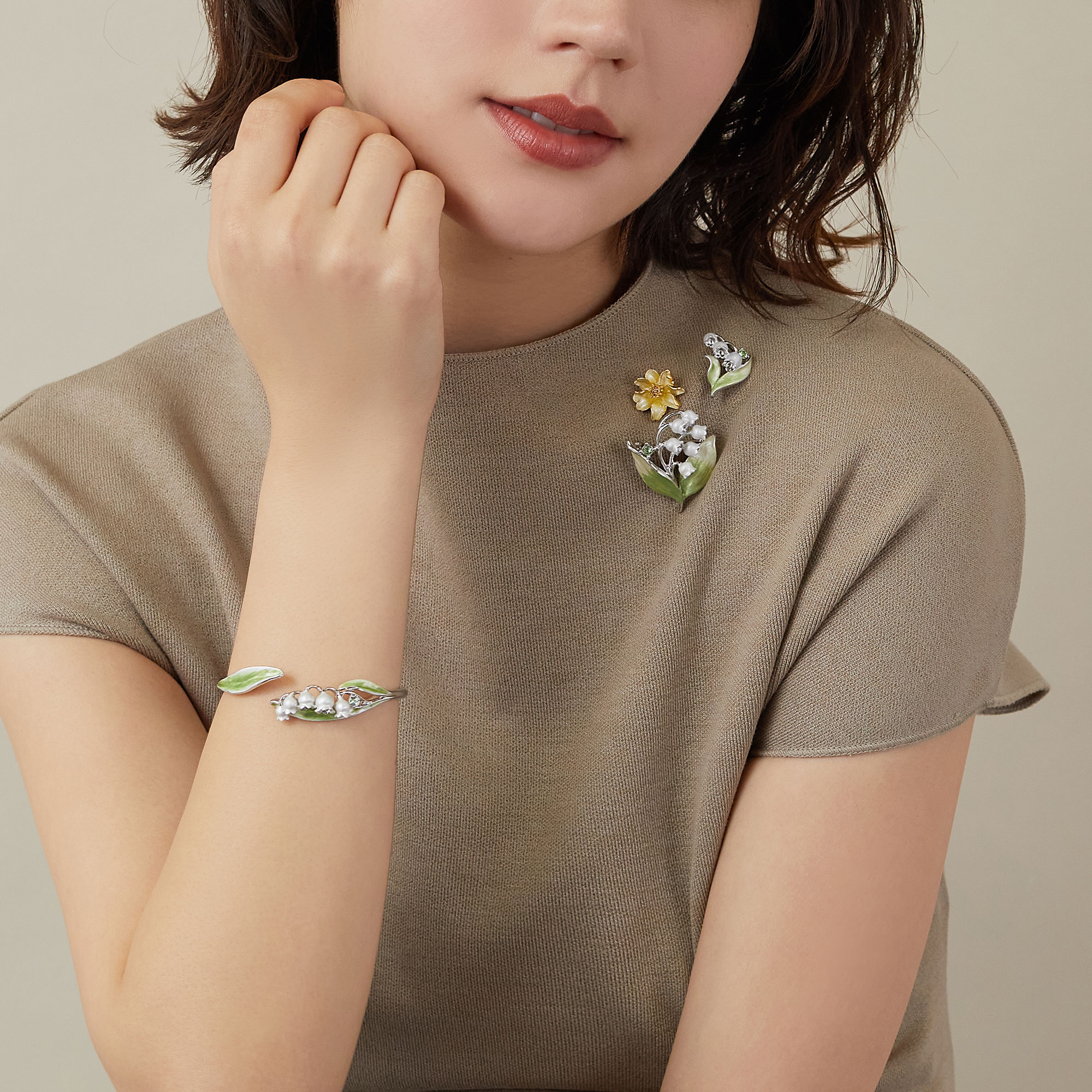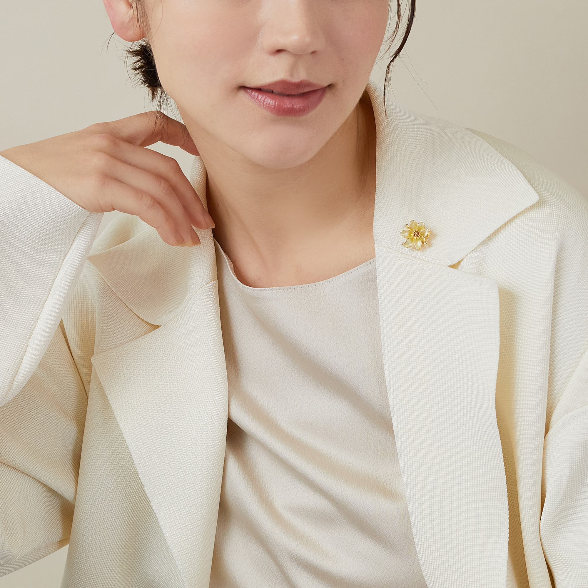 柔らかなバターイエローが鮮やかなマーガレットと、エレガントさとキュートさを兼ね備えた凛とした美しさが魅力のすずらんのブローチを重ねづけして、品よくスタイリングのポイントに。