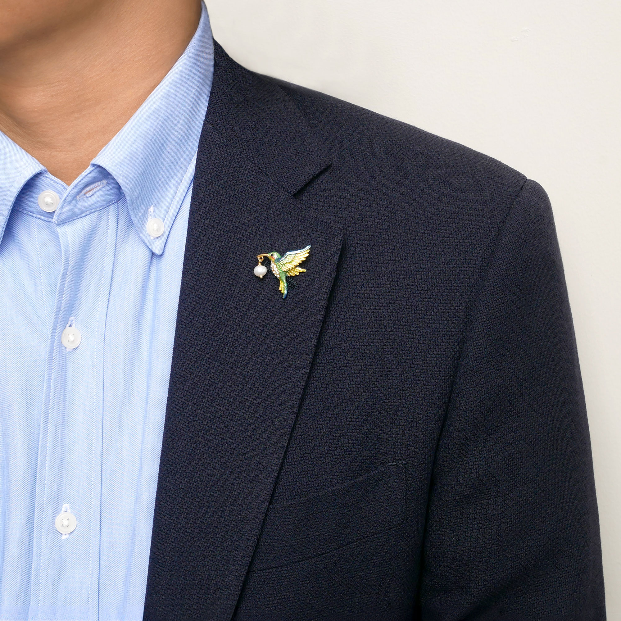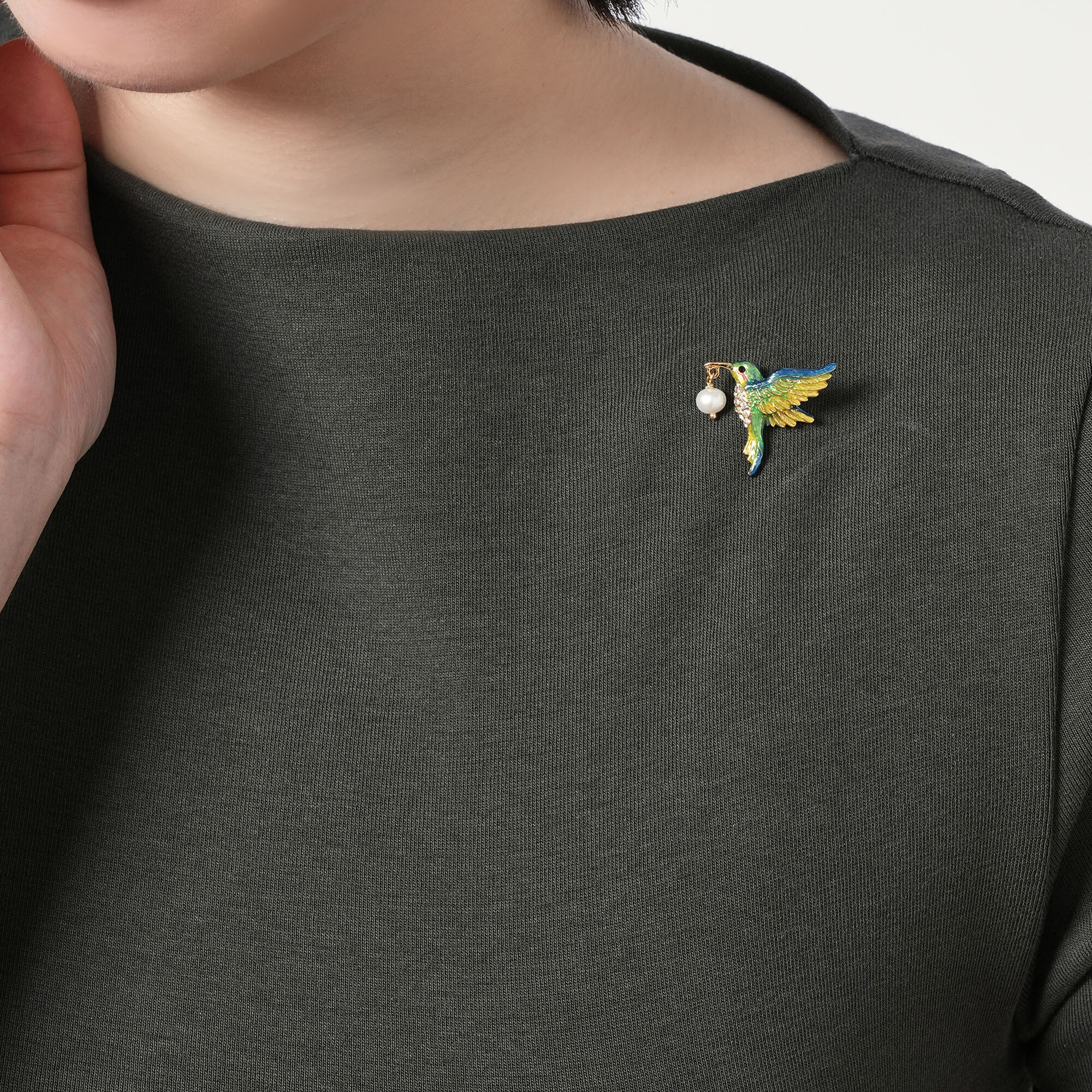 くちばしに揺れる淡水パールや、きらめくカットガラスが、美しい羽色にエレガンスを宿らせます。
