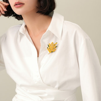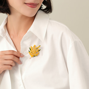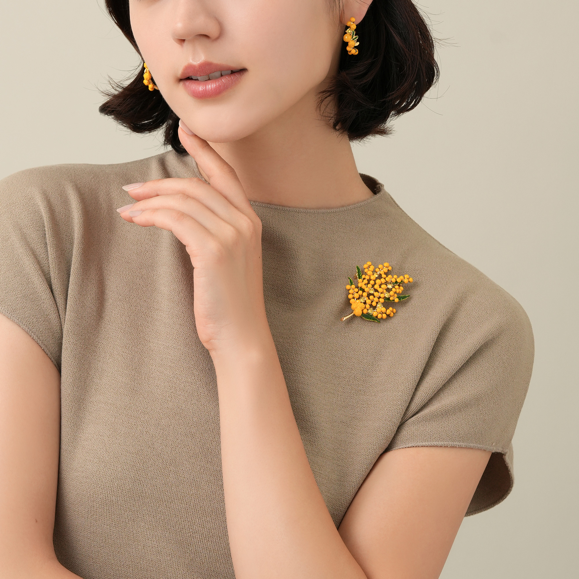 優雅さと可愛らしさを兼ね備えたミモザのブローチは、スタイリングを品良く彩るアイテムです。