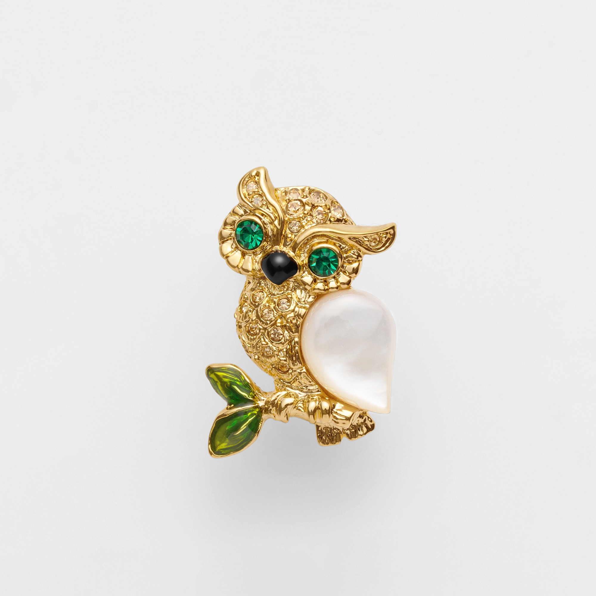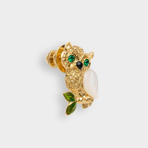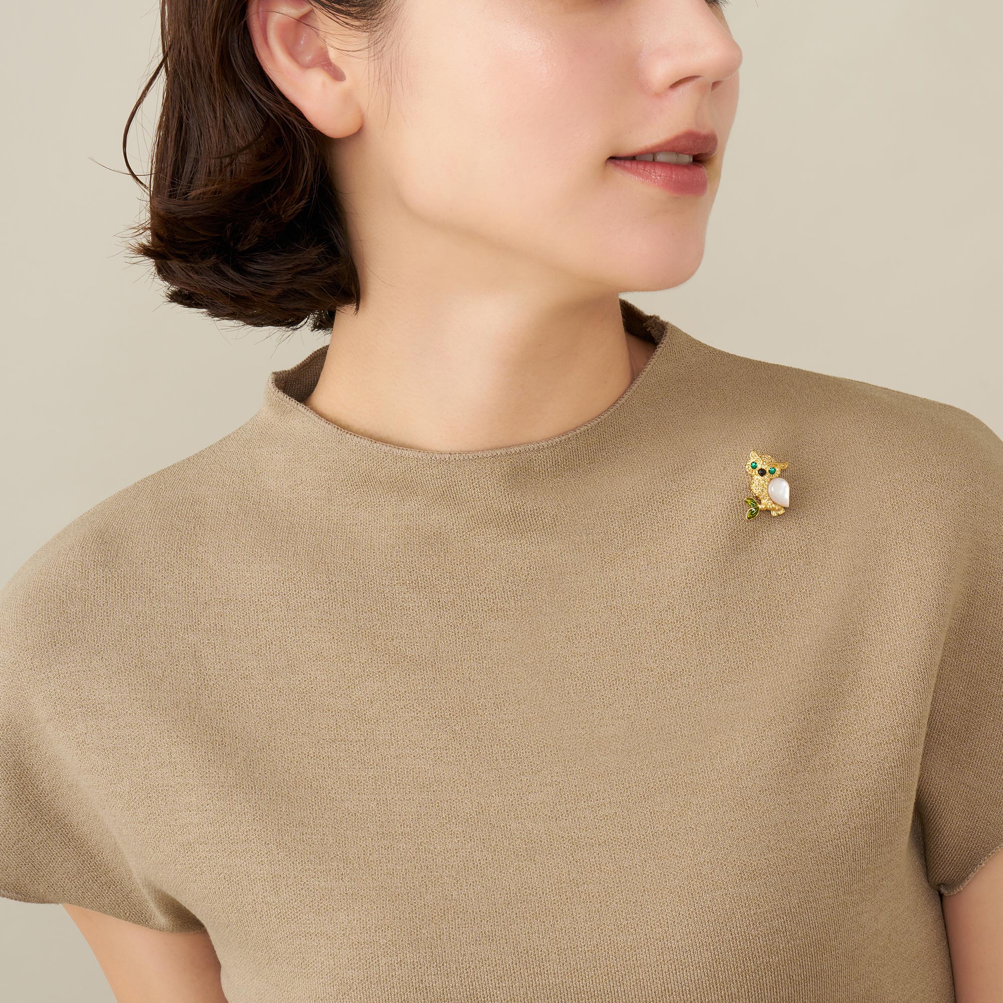 愛らしく小首をかしげ、森に誘うようなつぶらの瞳のフクロウのブローチ。