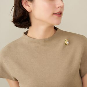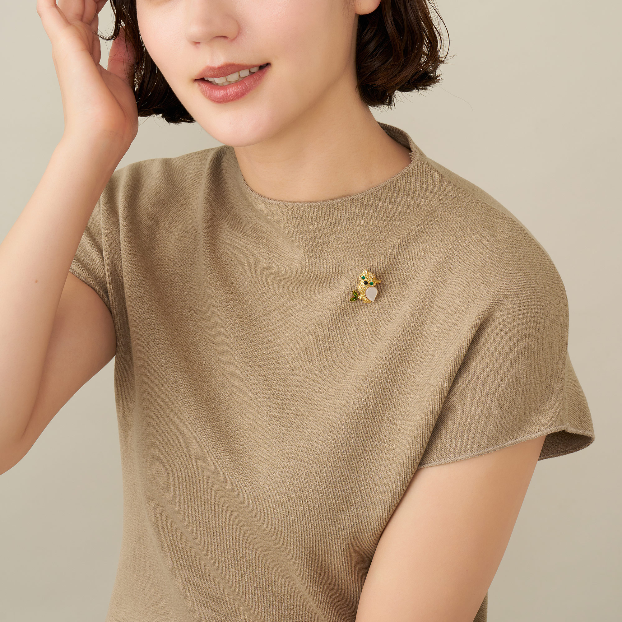 優しいベージュカラーのシェルの羽や、繊細なカットガラスの煌めきの中に映えるグリーンが美しく、胸元のワンポイントにぴったりです。