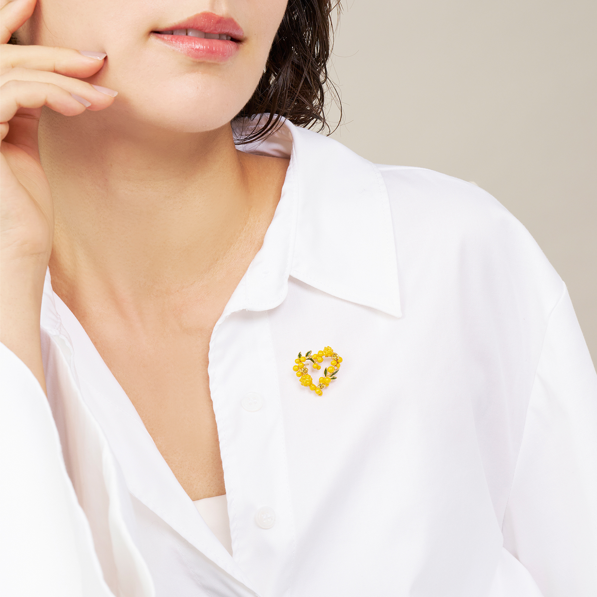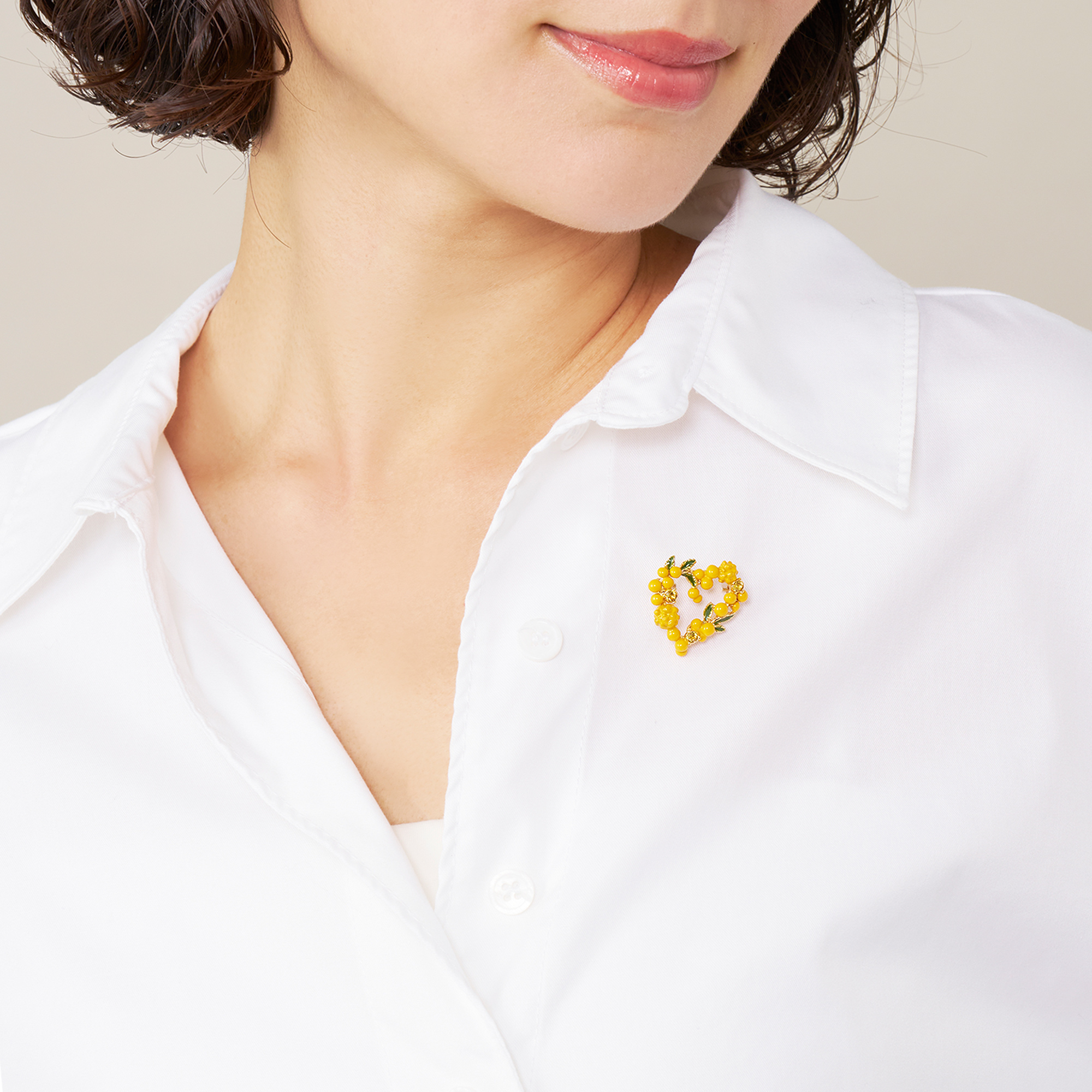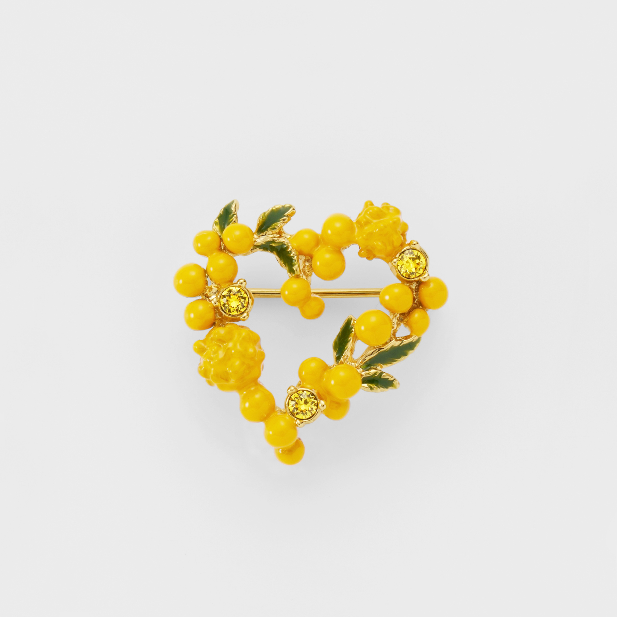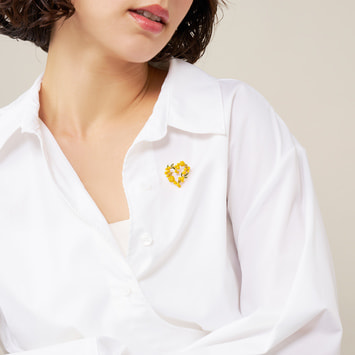 温かな日差しを浴びて輝く、フレッシュなイエローカラーが春らしいミモザのブローチ。