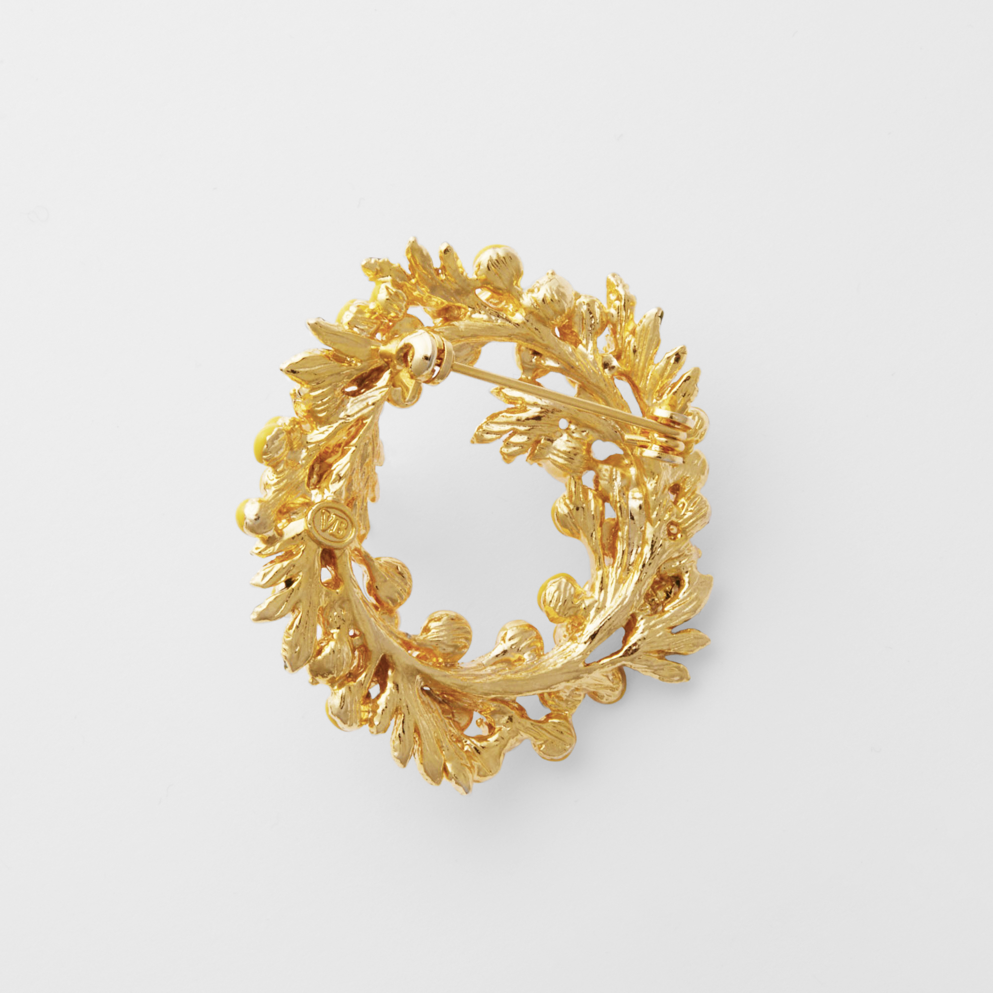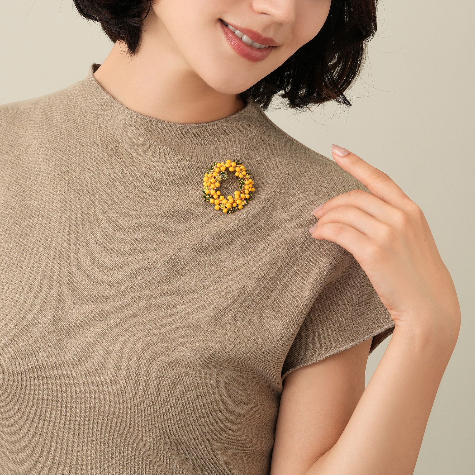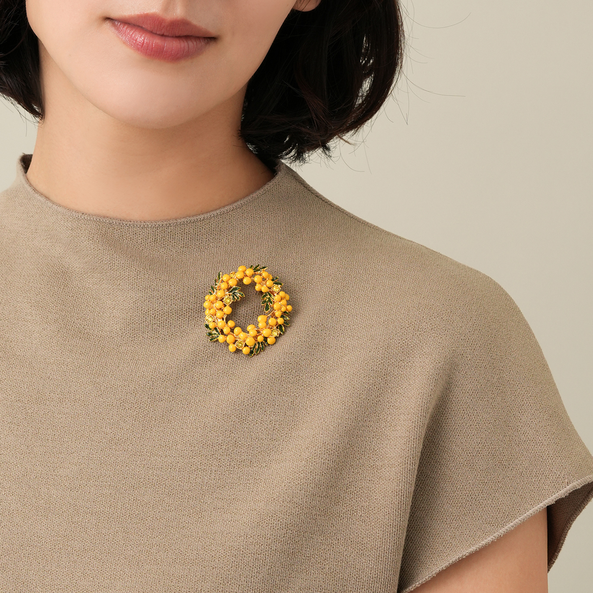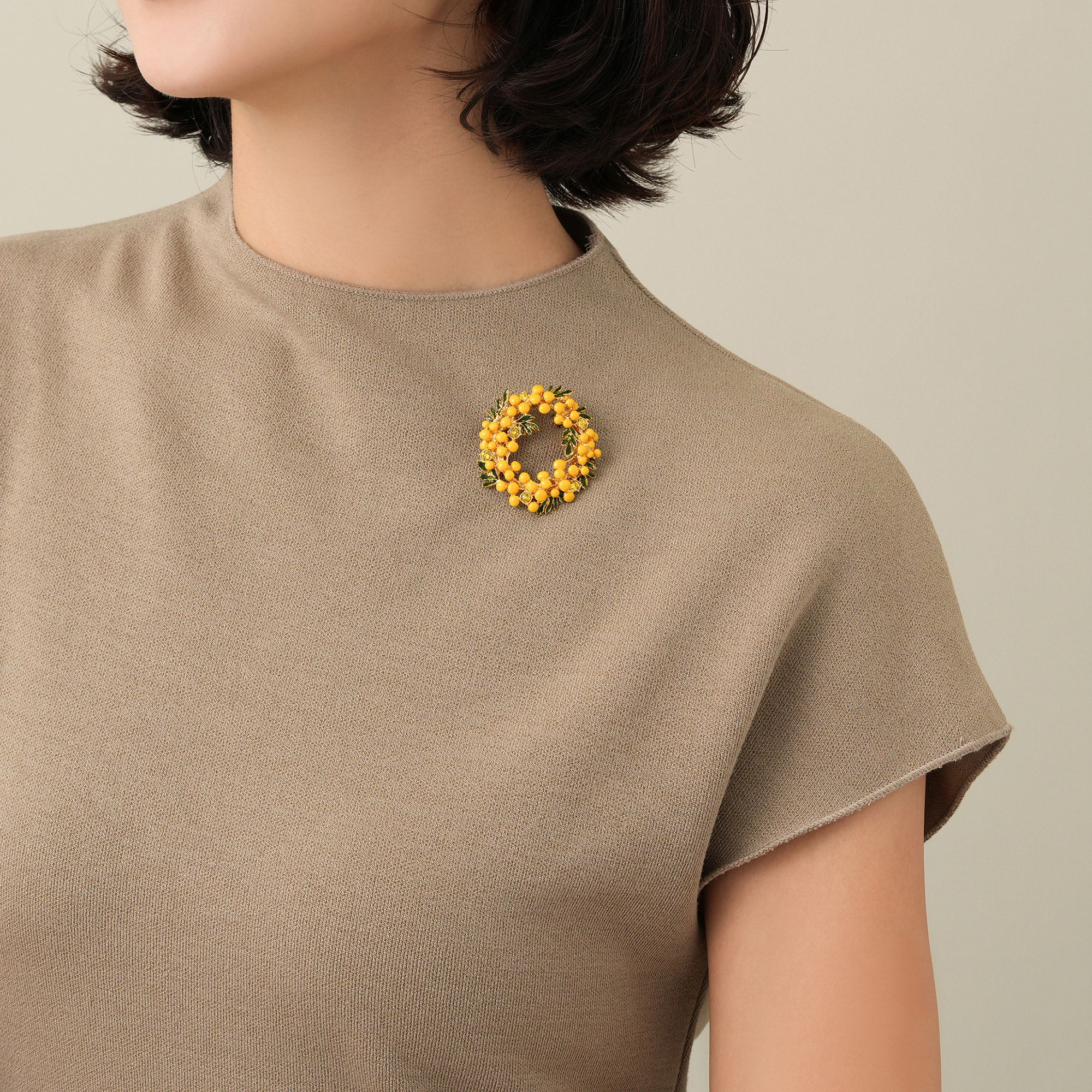 熟練の職人が一点一点、丁寧に色付けし、仕上げた『ミモザ』のブローチ。 ミモザの花言葉は「感謝」「優雅」「思いやり」。 ポンポンと寄せ集まった繊細な花の姿が由来だとされています。 優雅さと可愛らしさを兼ね備えたリース型でスタイリングのワンポイントに。