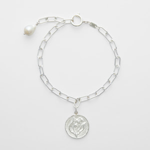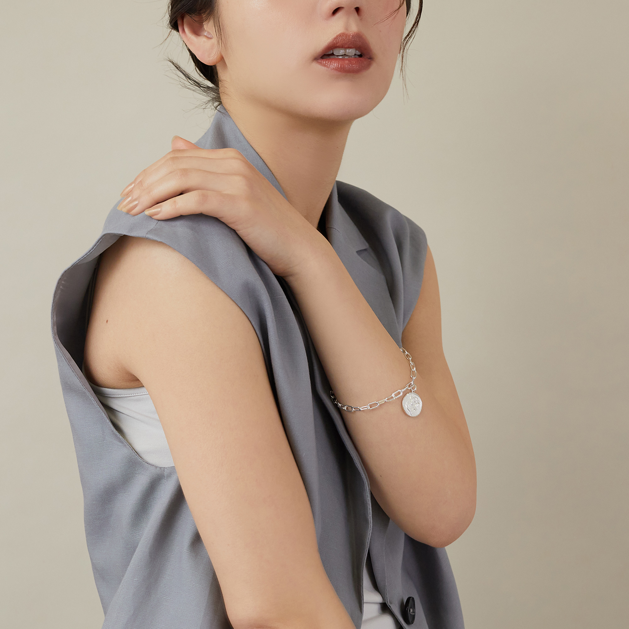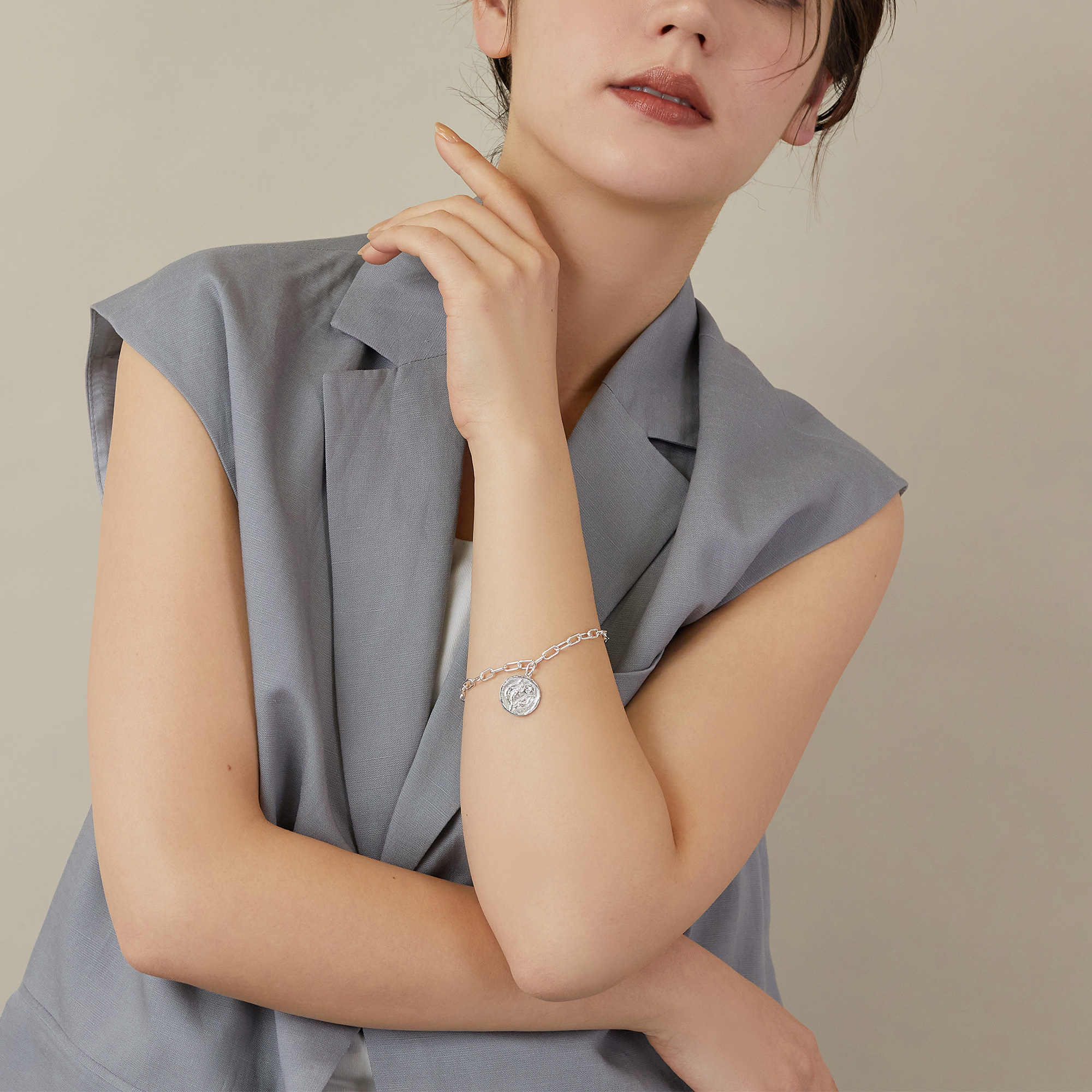 すずらん模様のレリーフを入れ、ローマ時代のコインのように仕上げたシルバーチャームのブレスレット。
