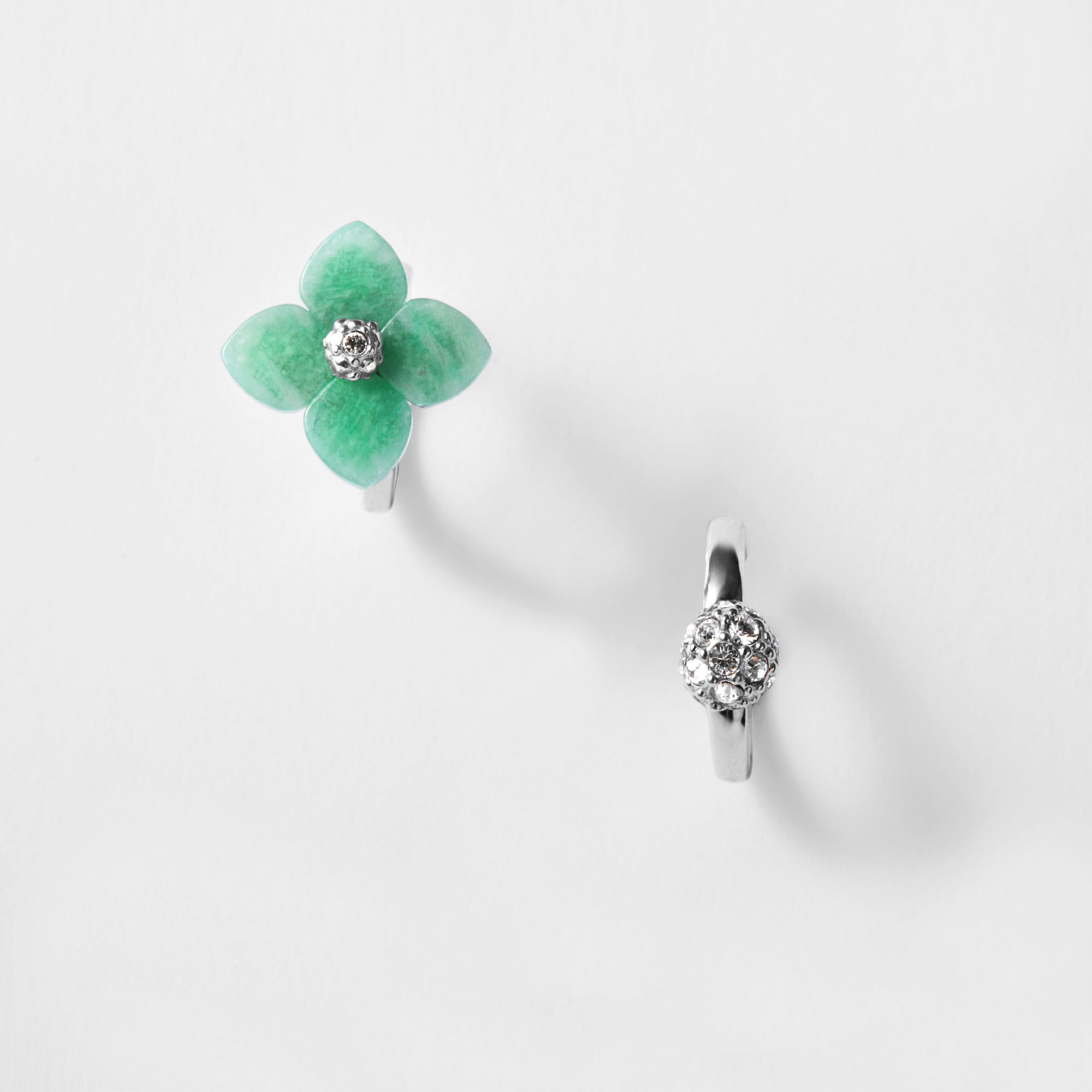 稀少なアマゾナイトを1つ1つ丁寧にかたどった可憐な花と、カットガラスのパヴェボールとのセット付けで耳元を華やかな印象に。