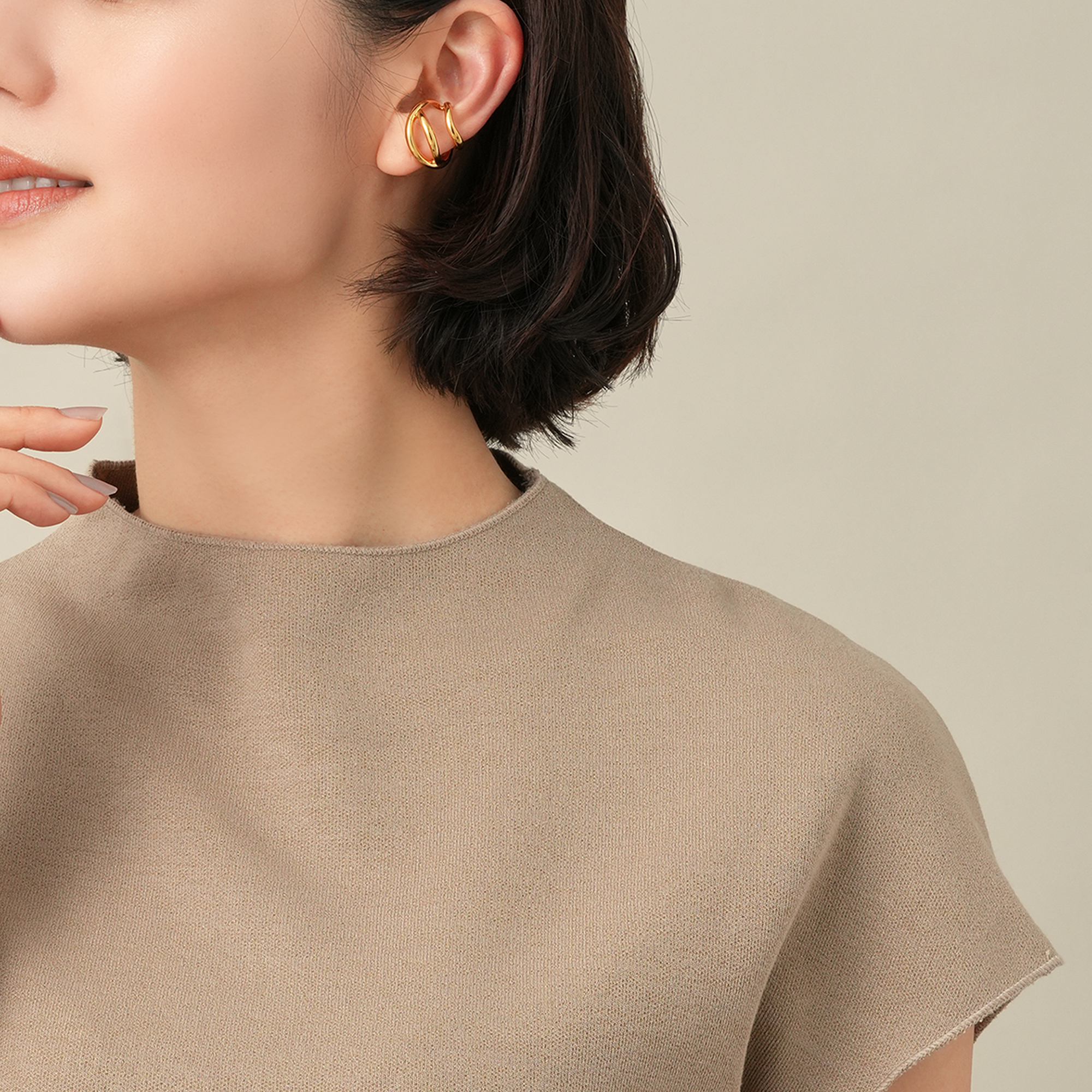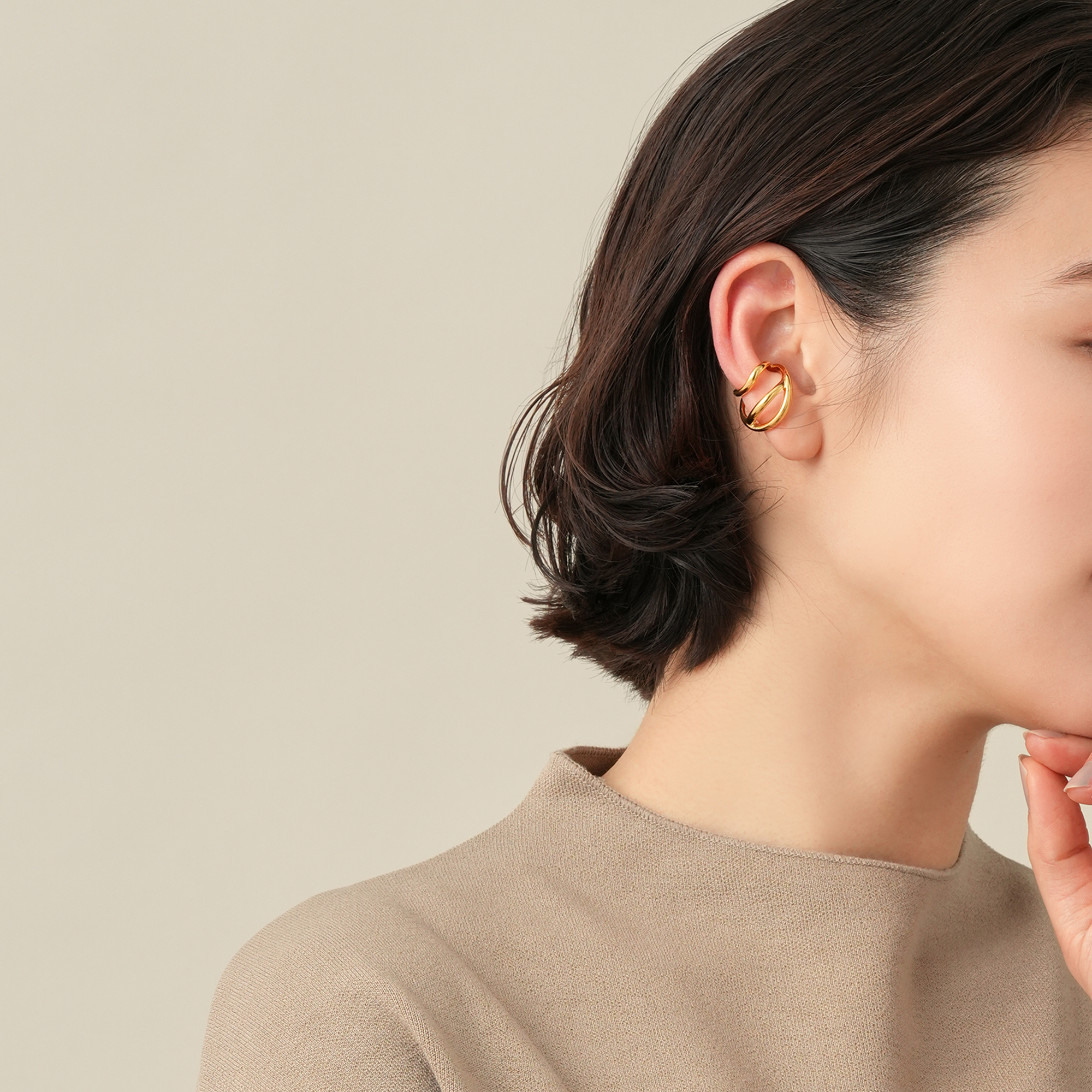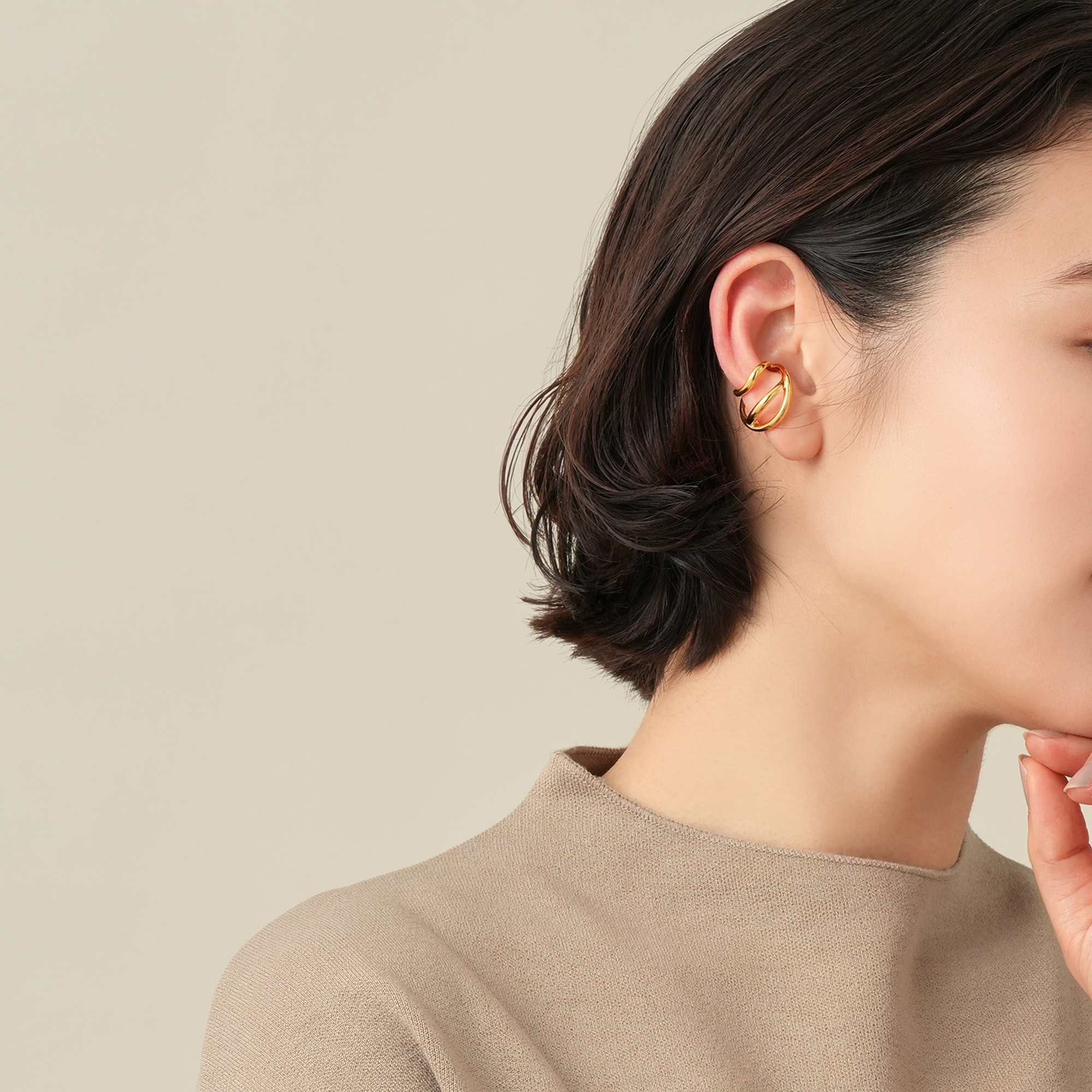 オーガニックなフォルムが特徴のイヤーカフ。 大小異なるサイズのフープが耳を柔らかに包みこむデザインです。 程よいサイズ感で、他のイヤーアイテムとの重ね着けも楽しめます。 つくりの良さと着けやすいサイズ感が魅力。スタイルやシーンを選ばず、さり気ない存在感でスタイリッシュに演出してくれます。