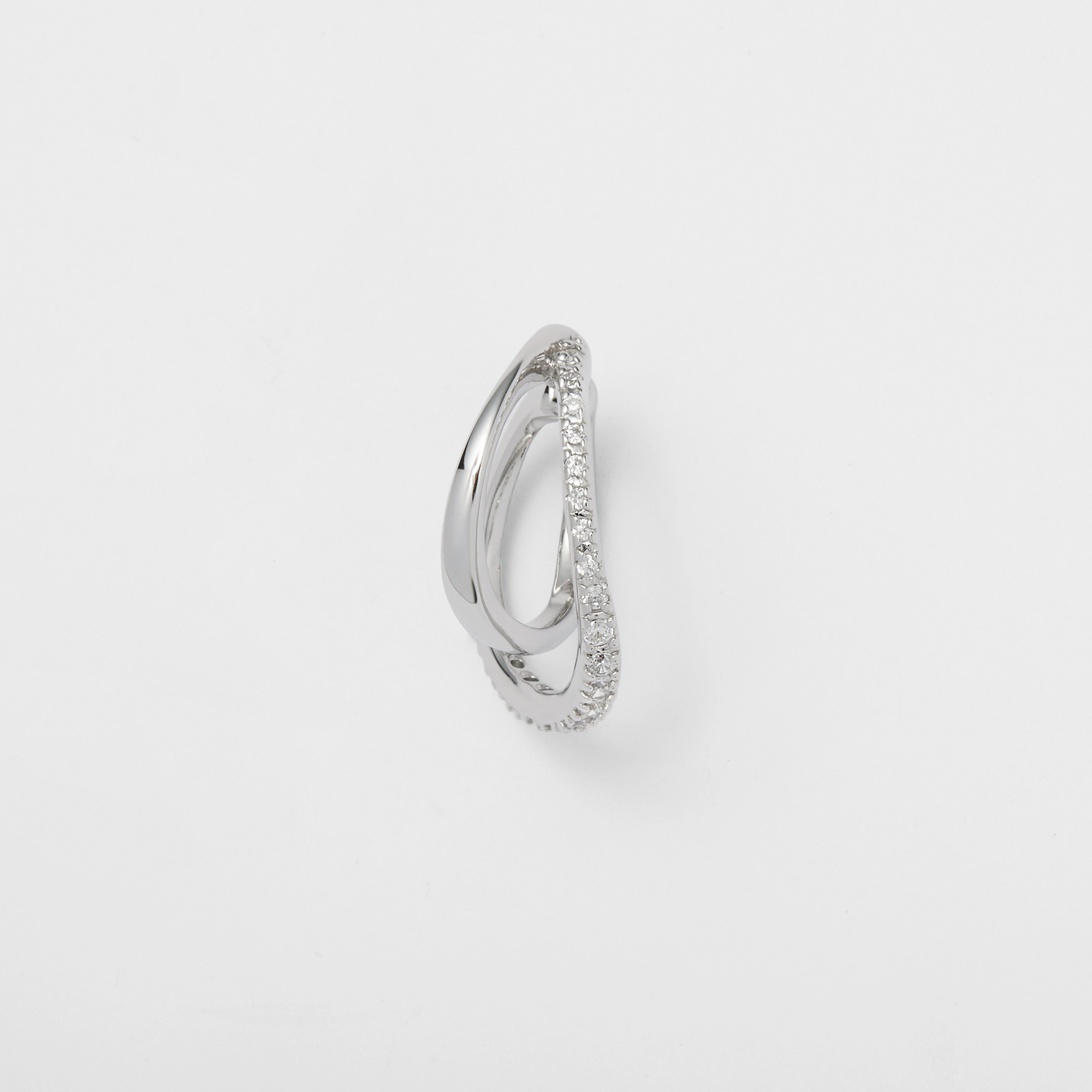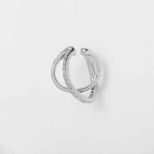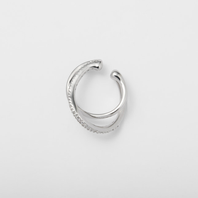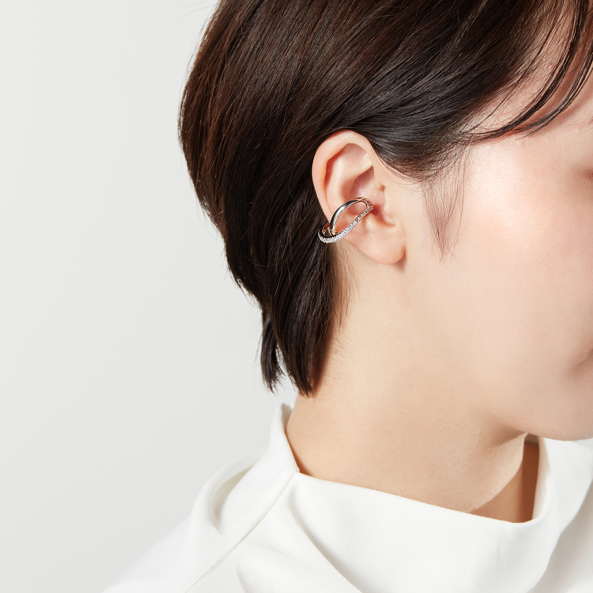 シャイニーなメタルとキュービックジルコニアの2本のラインが柔らかく重なり合ったイヤーカフ。どの角度から見ても美しい立体的なフォルムで、印象的な耳元に。モダンなメタルの輝きにキュービックジルコニアの上品な輝きが、スタイリングを華やかに演出します。つけ心地のよさを実感できるイヤーカフです。