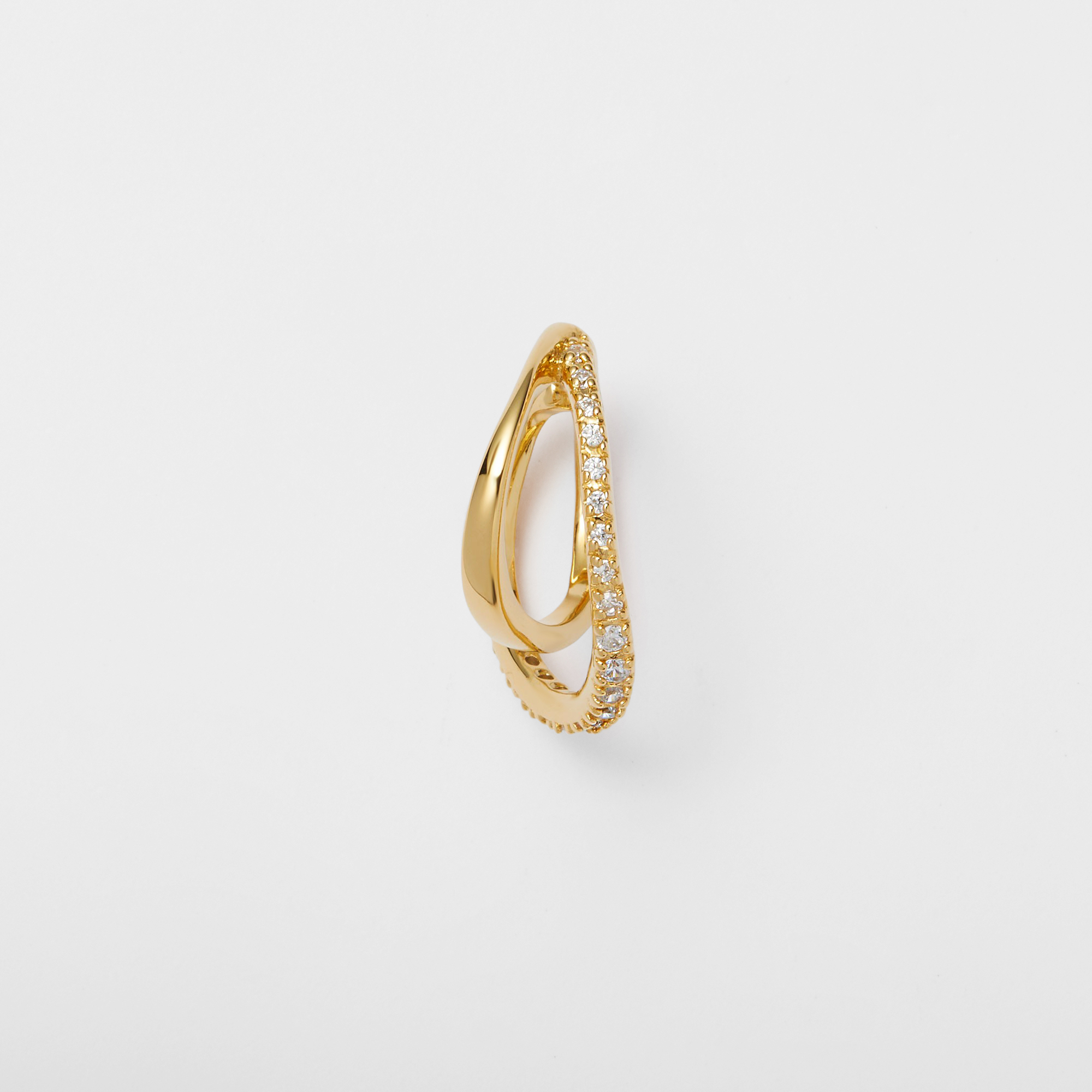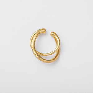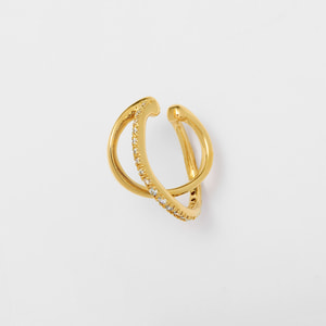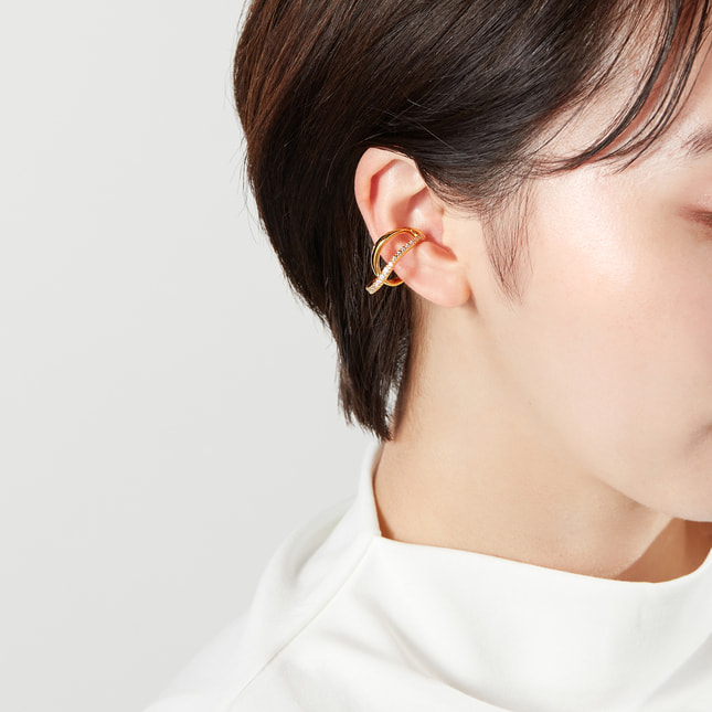 シャイニーなメタルとキュービックジルコニアの2本のラインが柔らかく重なり合ったイヤーカフ。どの角度から見ても美しい立体的なフォルムで、印象的な耳元に。モダンなメタルの輝きにキュービックジルコニアの上品な輝きが、スタイリングを華やかに演出します。つけ心地のよさを実感できるイヤーカフです。