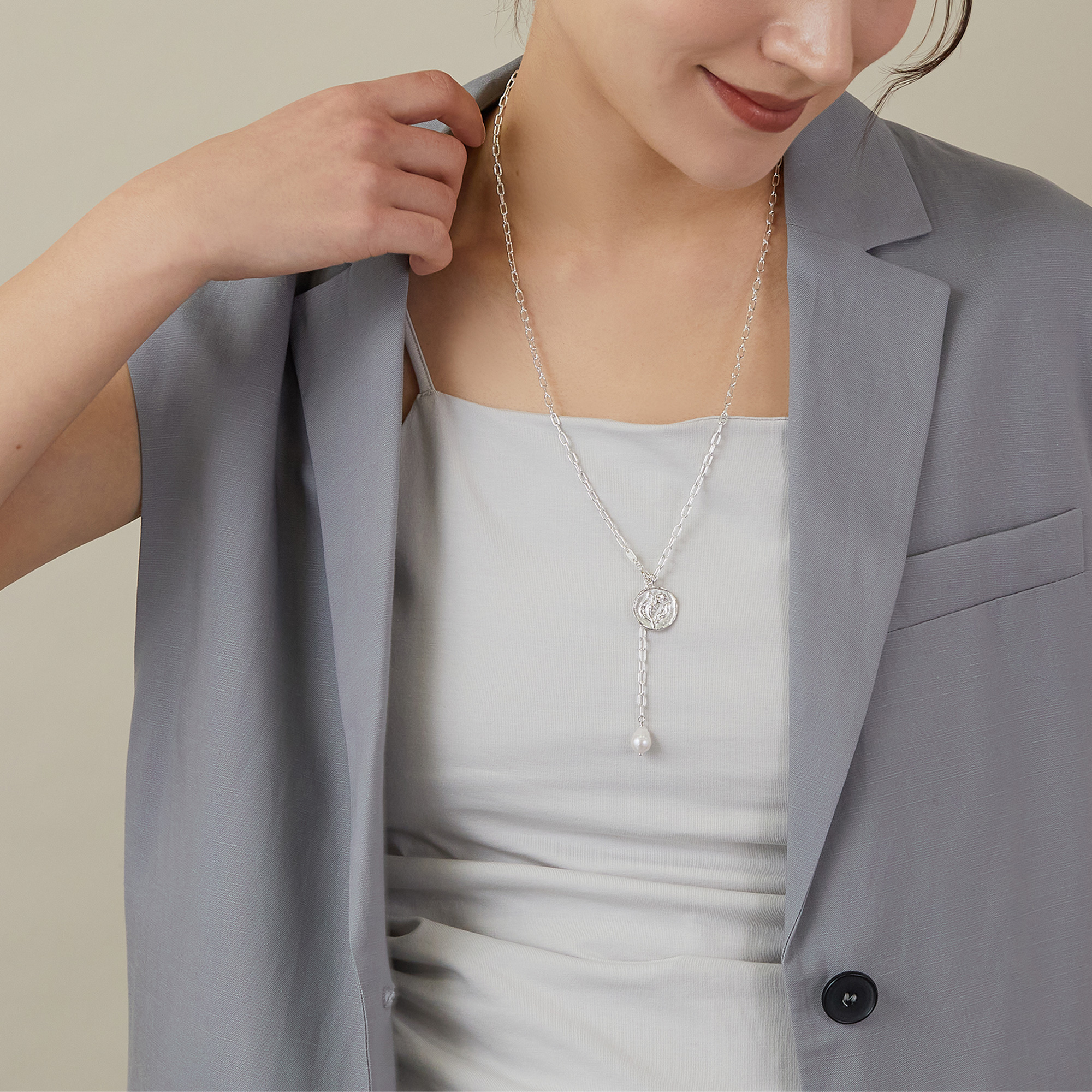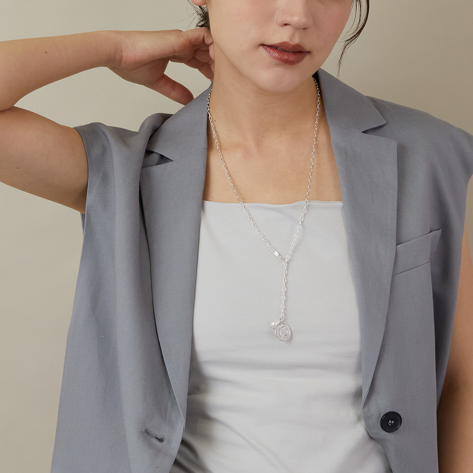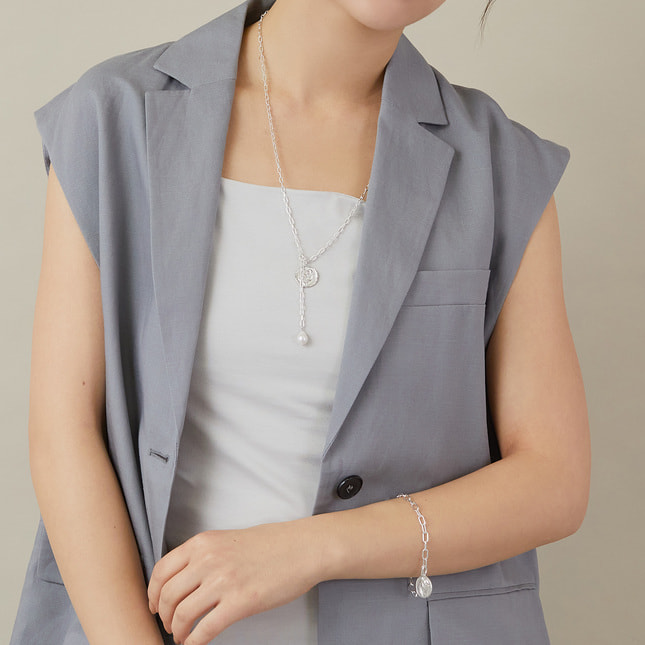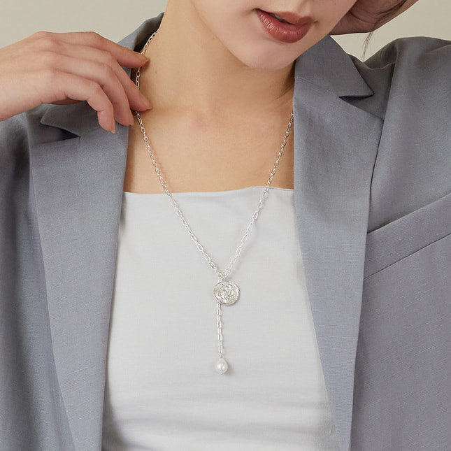 お好きな位置に金具を止められるので、その日の装いやシーンに合わせた様々なスタイリングをお楽しみいただけるネックレスです。