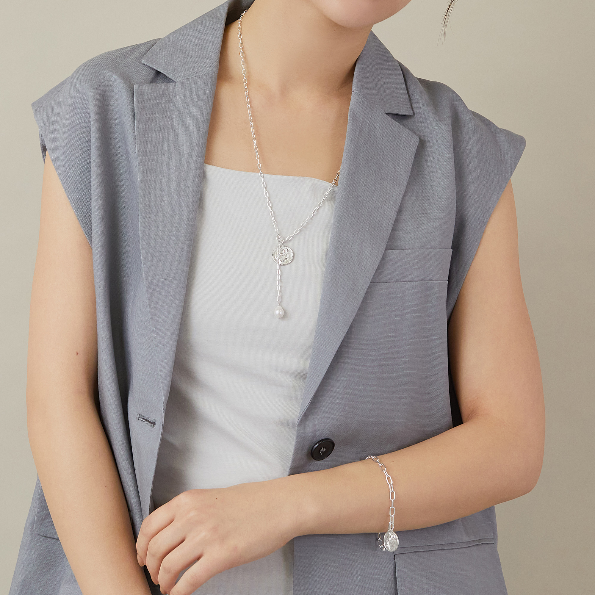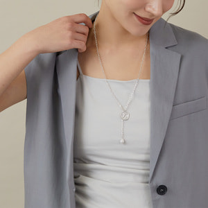レクタングルチェーンが洗練された印象を与え、エンドに揺れるバロック淡水真珠がナチュラルなニュアンスをプラスします。
