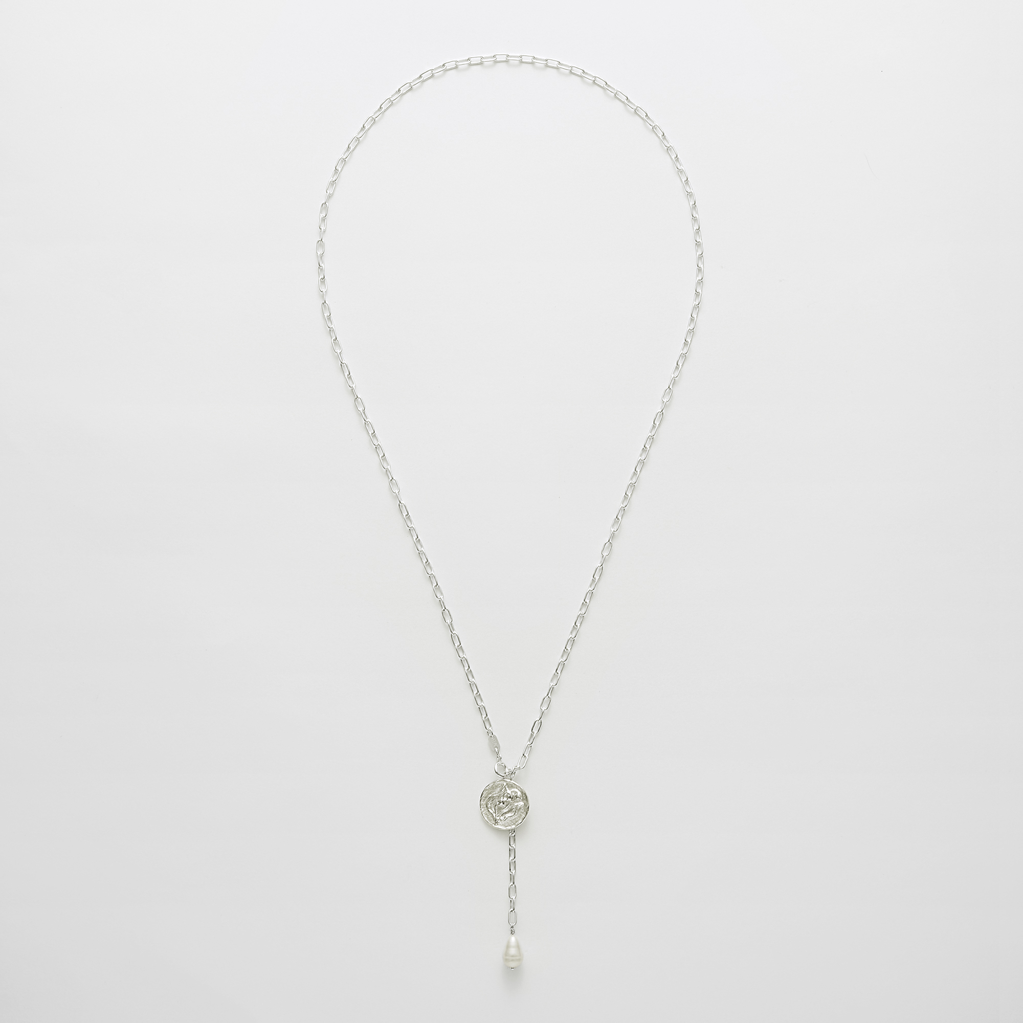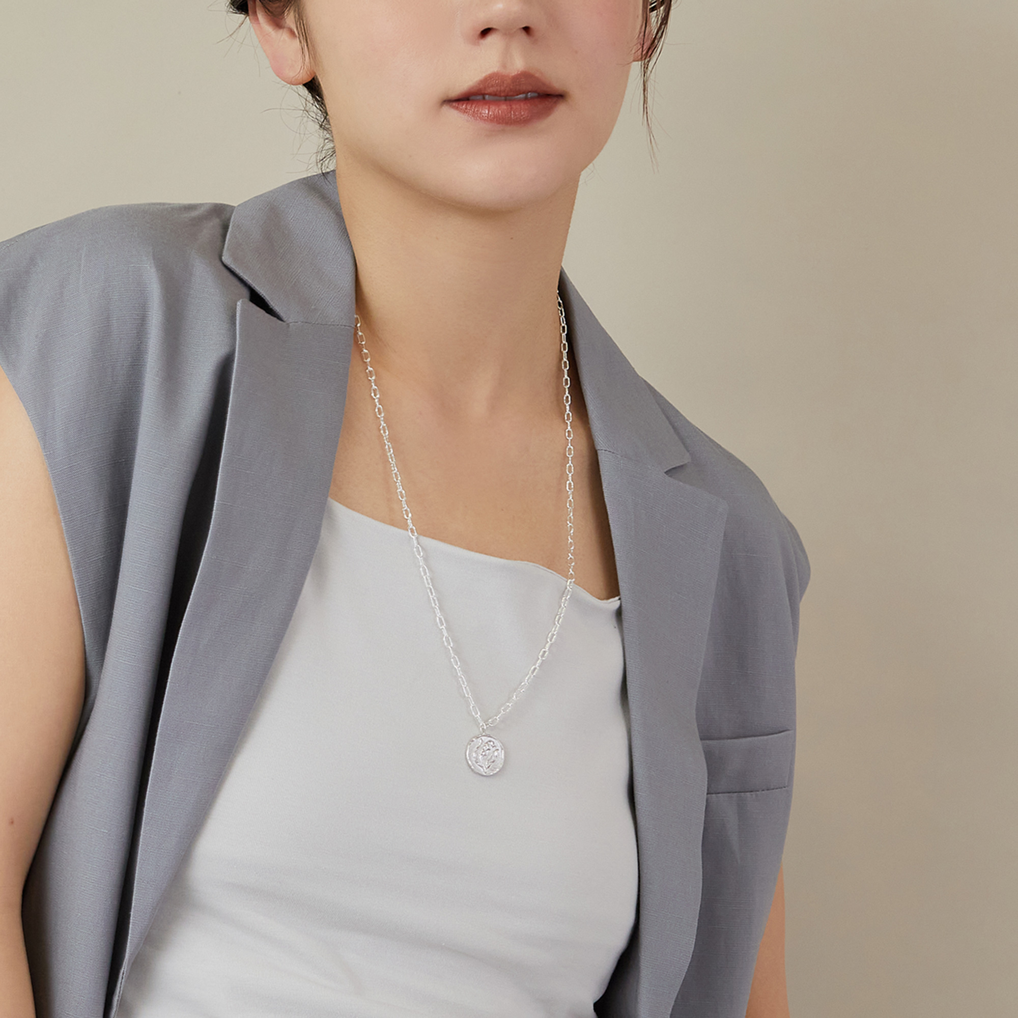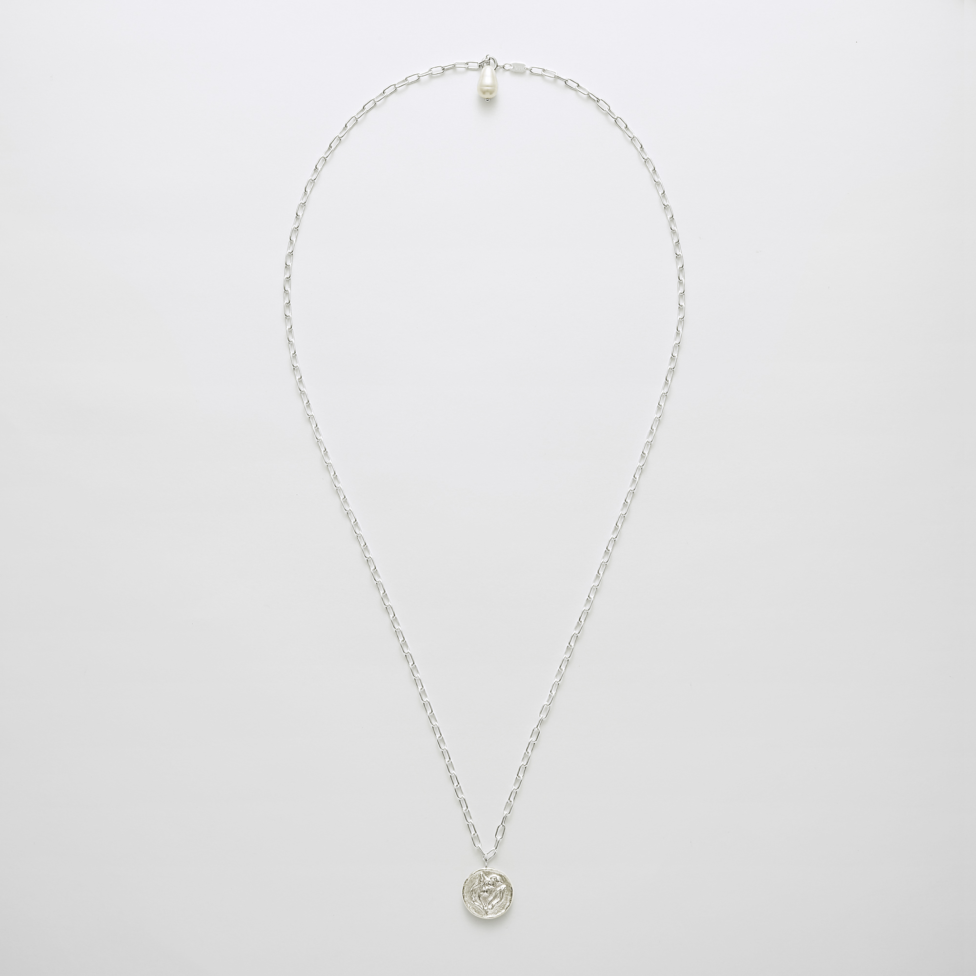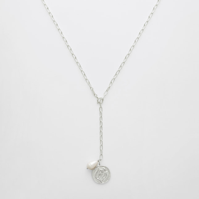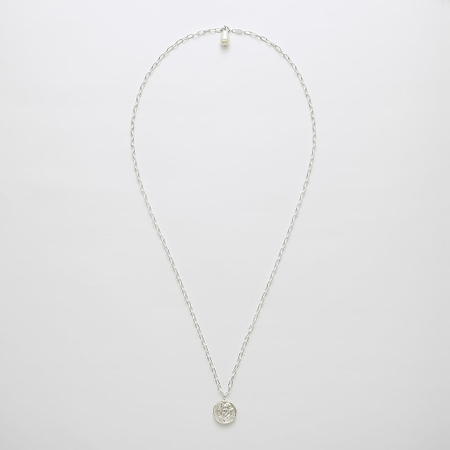 すずらん模様のレリーフを入れ、ローマ時代のコインのように仕上げたシルバーチャームのネックレス。