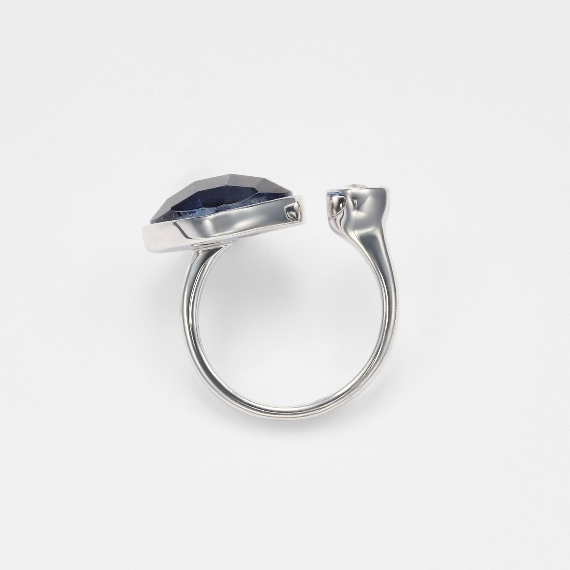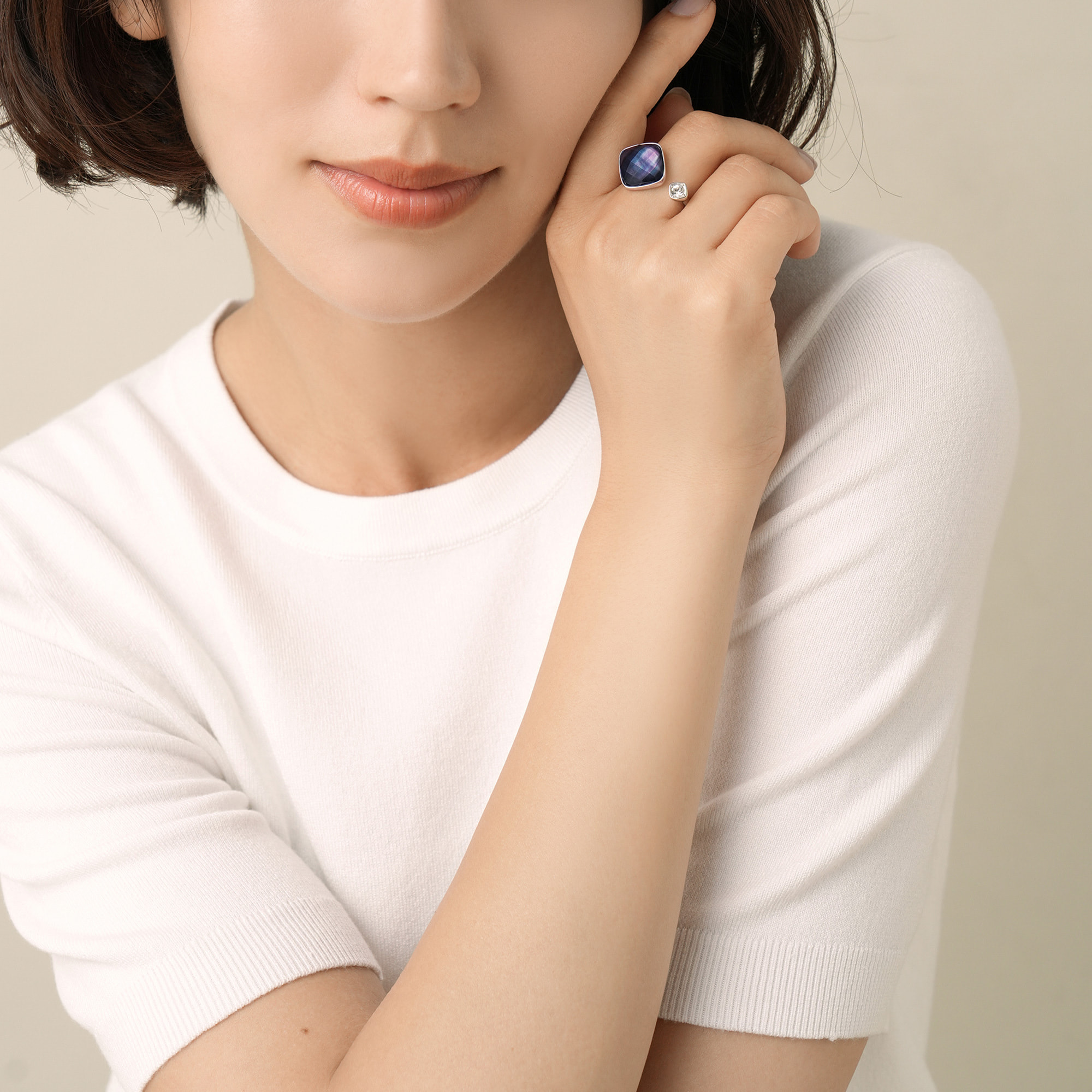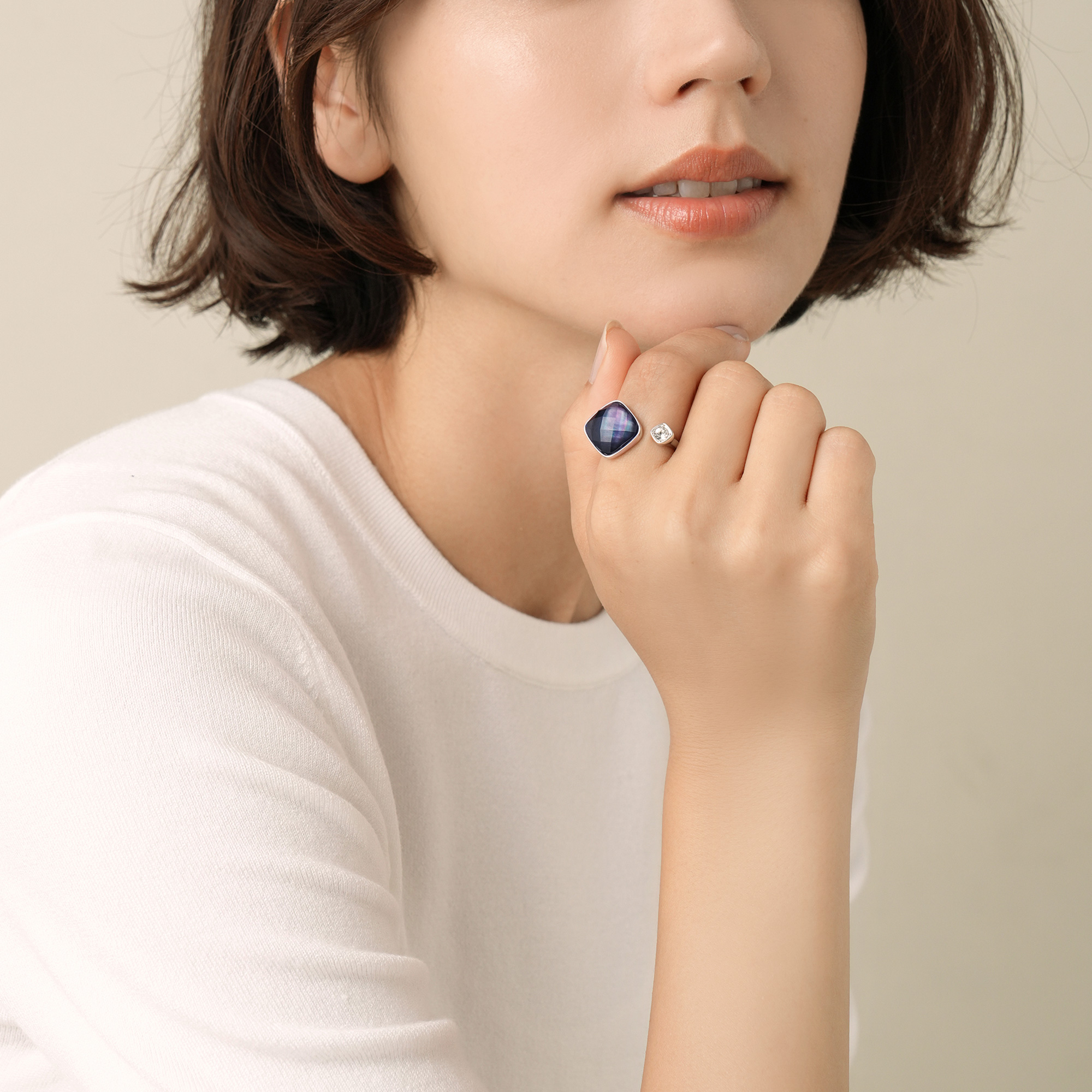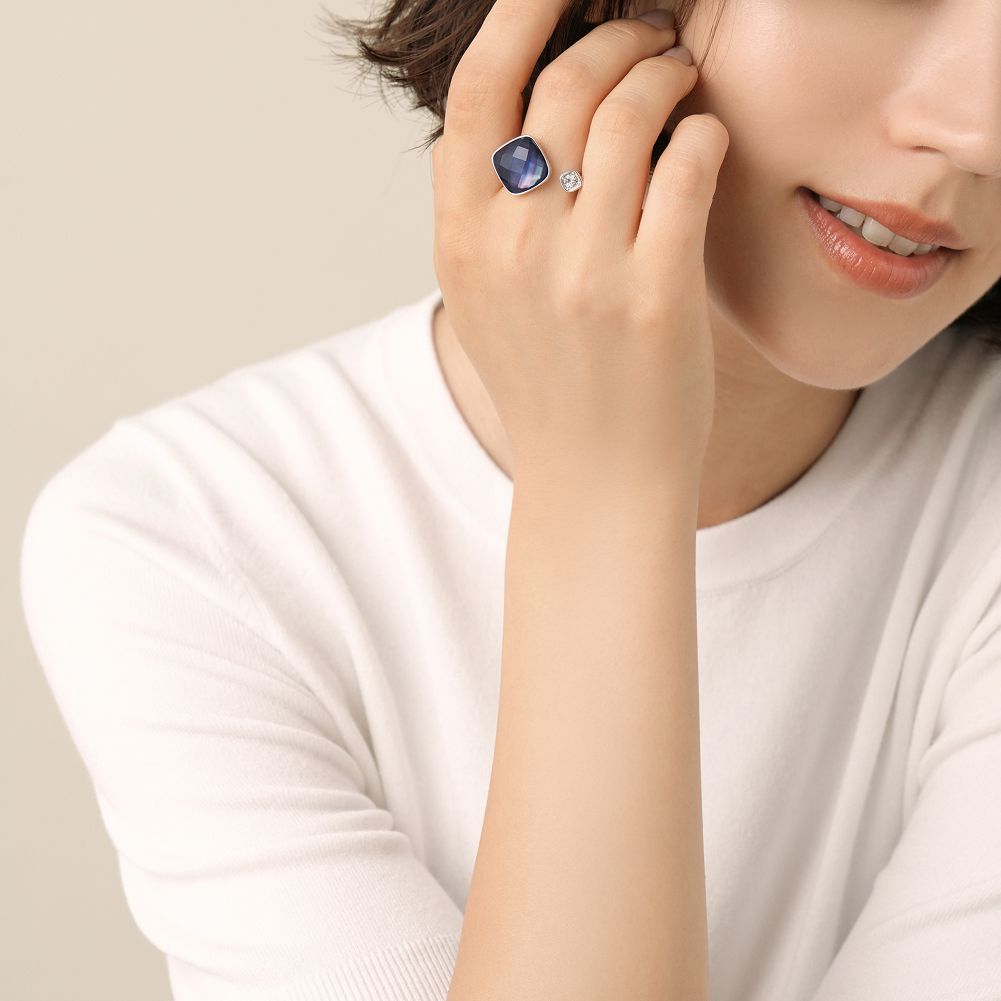 ダブレットストーンは、見る角度で虹色に変化する黒蝶貝と繊細なカットを施したカラーストーン(合成ブルークォーツ)を重ねることにより、表情豊かで立体的な陰影をもたらします。