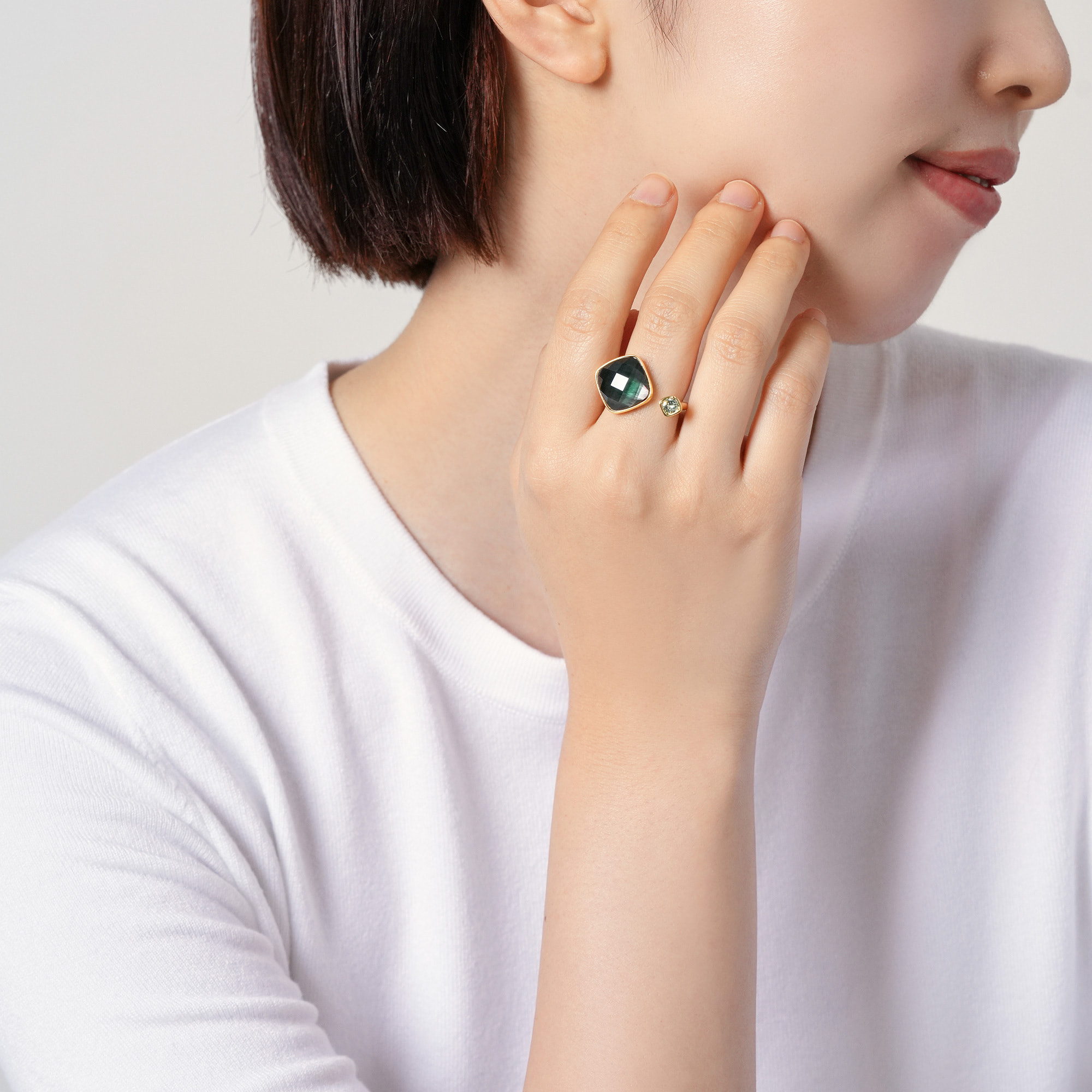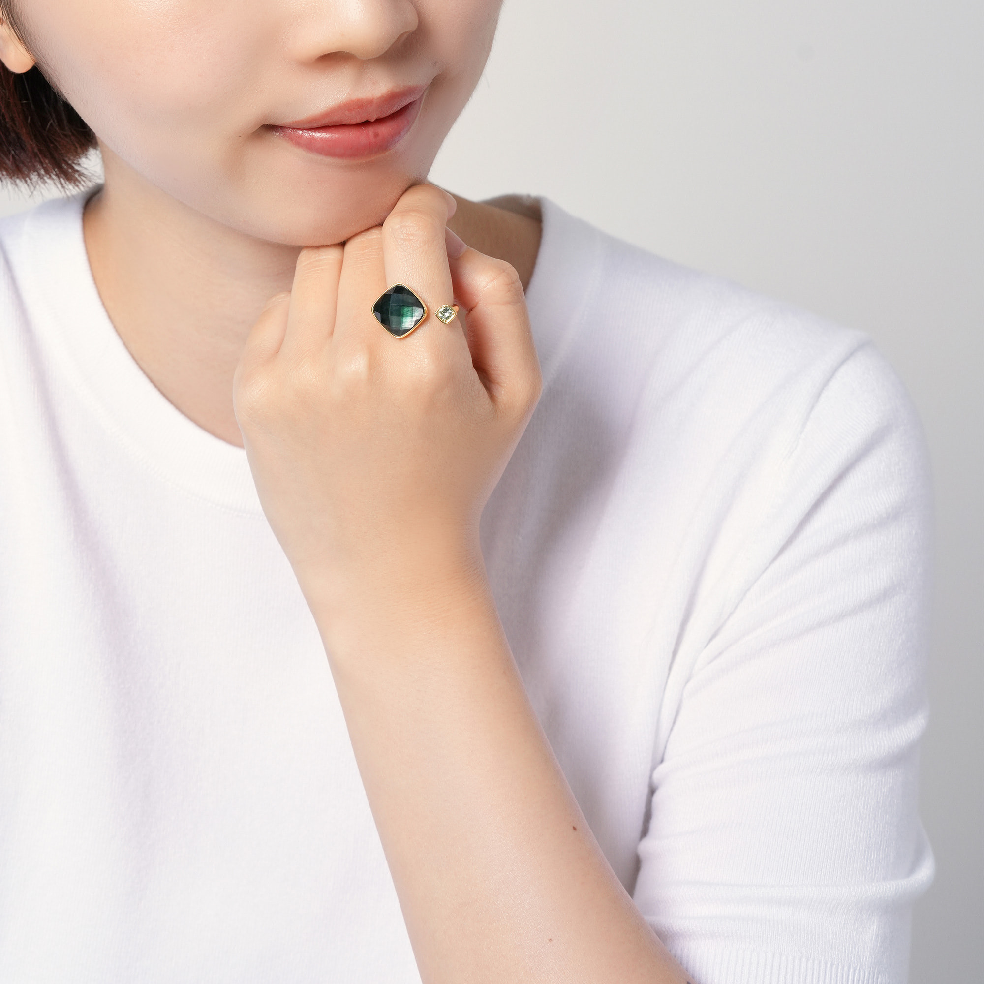 ダブレットストーンは、見る角度で虹色に変化する黒蝶貝と繊細なカットを施したカラーストーン(合成グリーンクォーツ)を重ねることにより、表情豊かで立体的な陰影をもたらします。