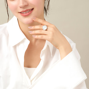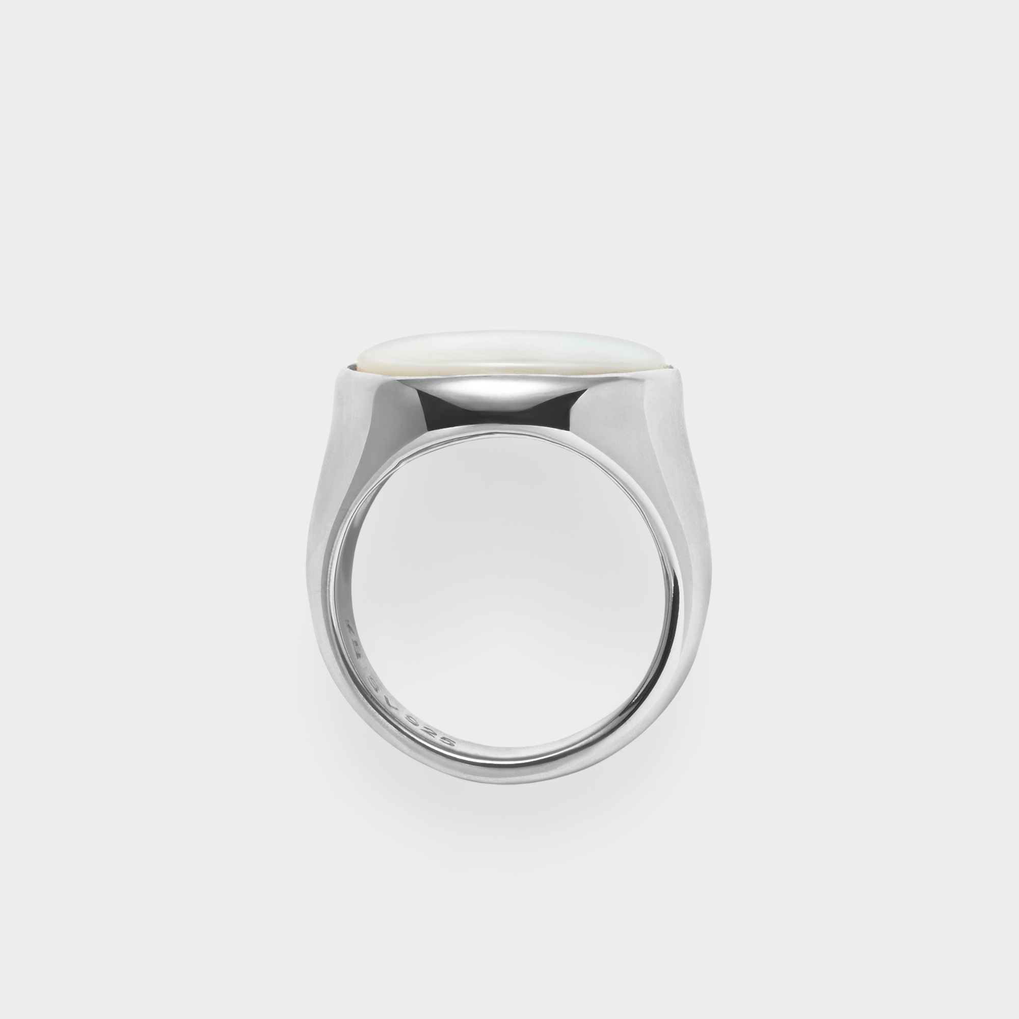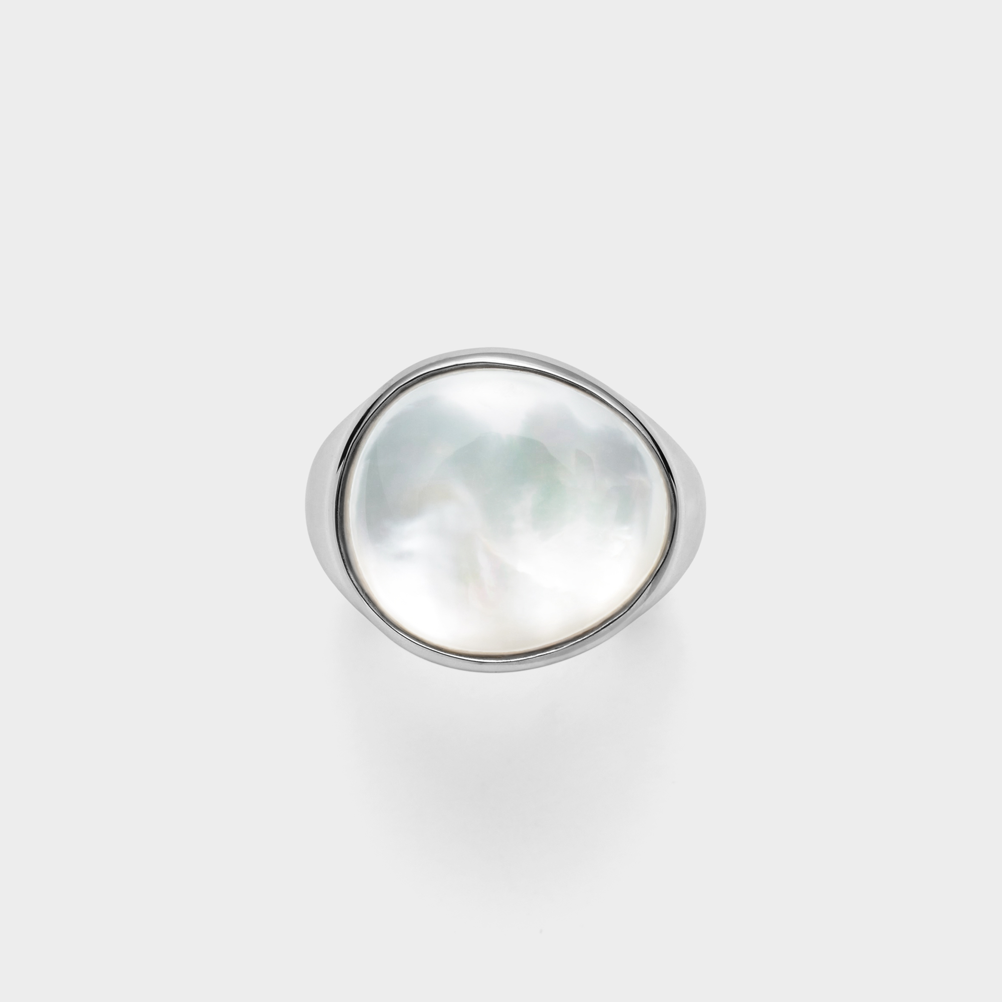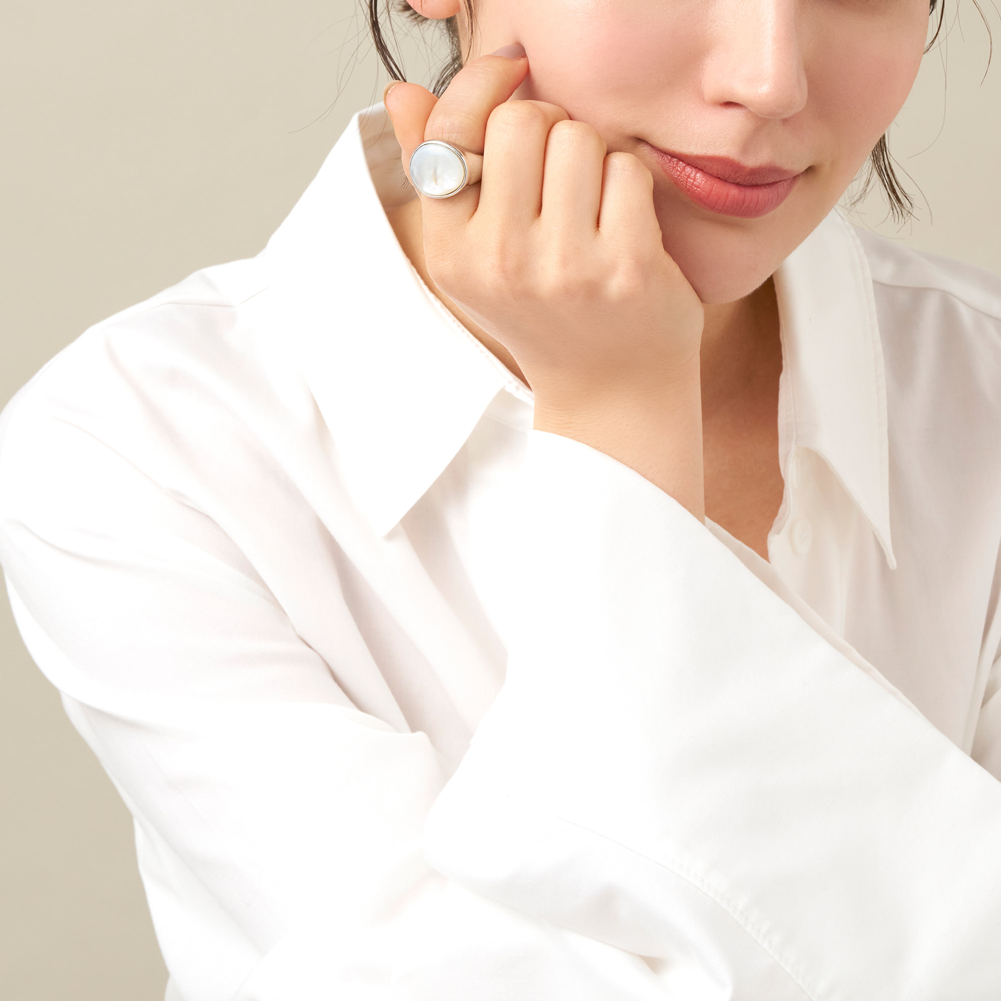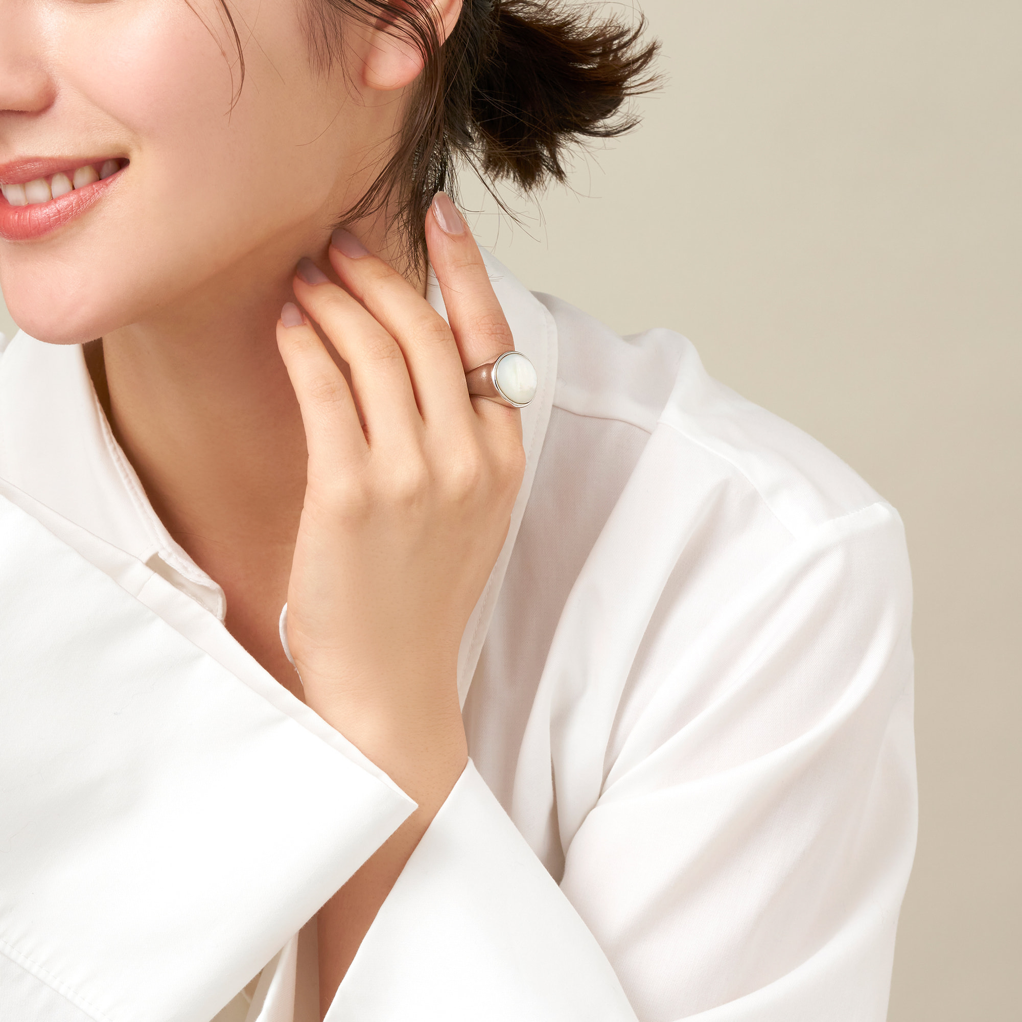 モダンなシルバーカラーと白蝶貝のゆらめく虹彩のコントラストが美しいリング。