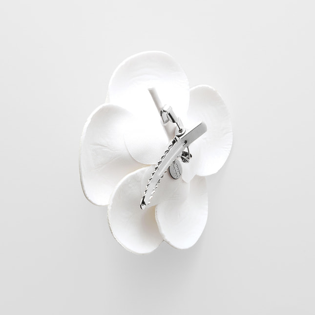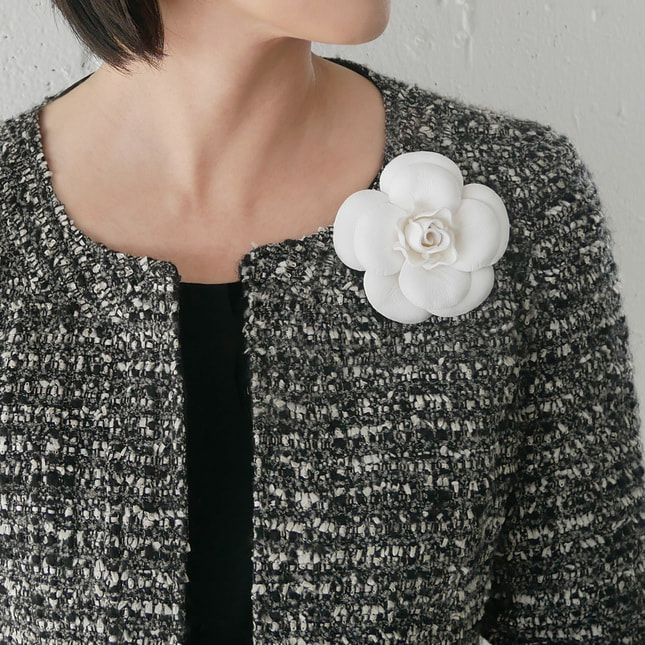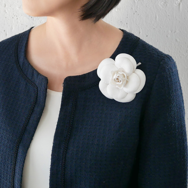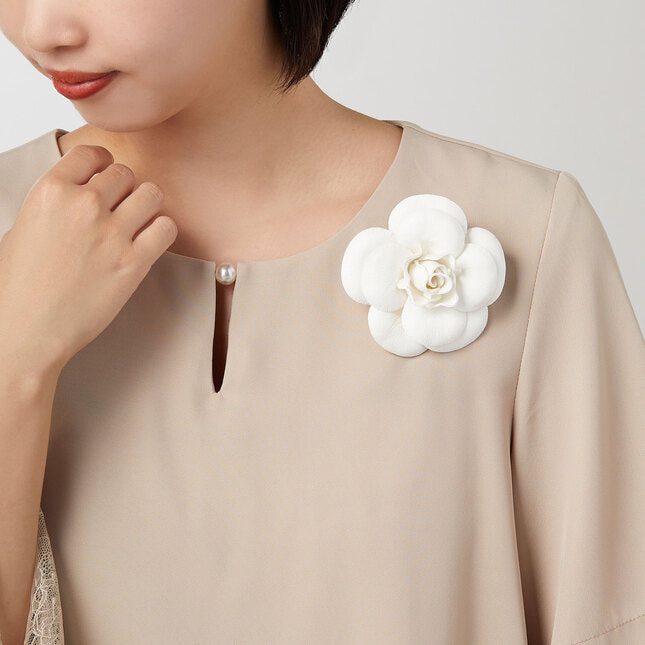 ノーブルでモダンな印象のカメリアのコサージュ。