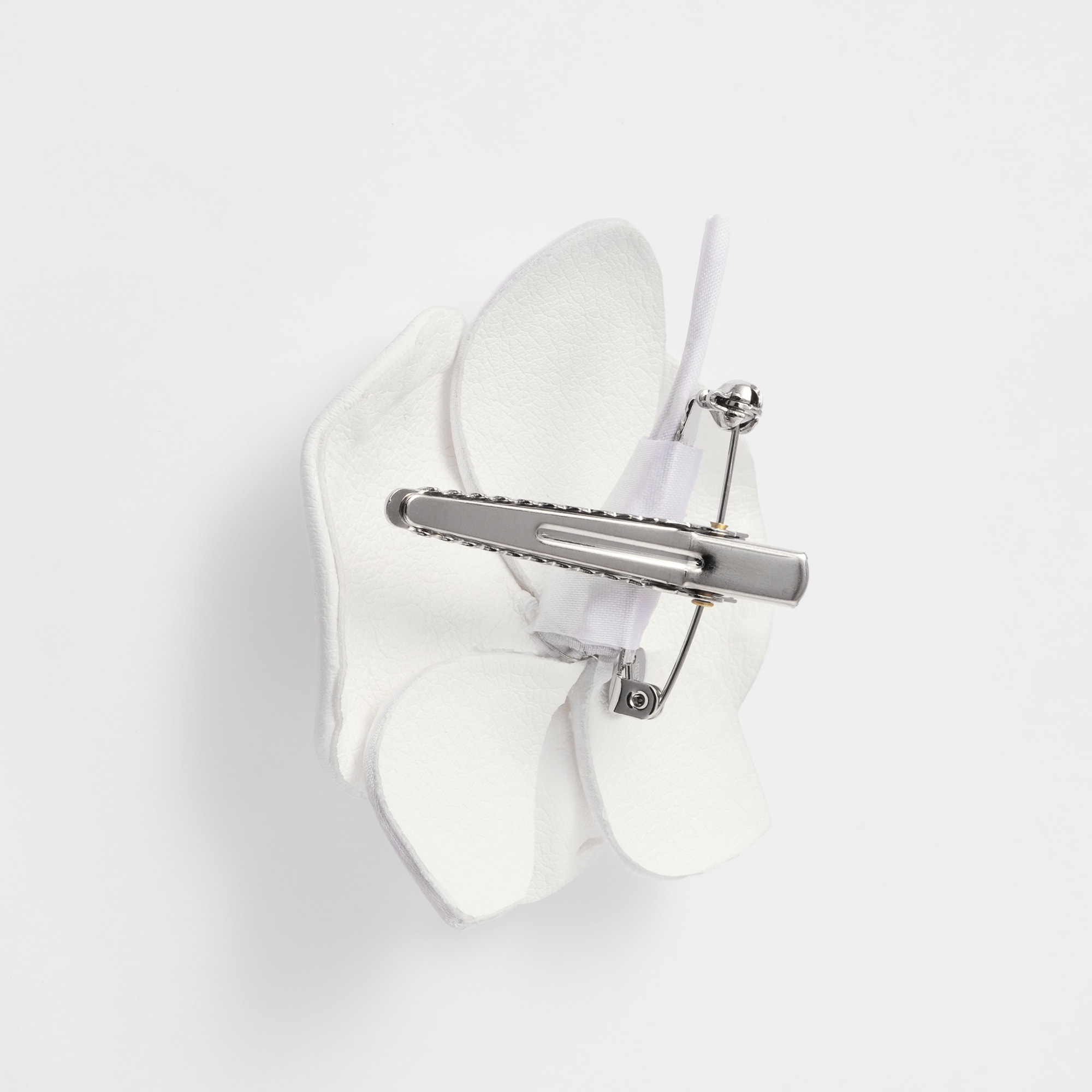 花弁により生地を変え、レザータッチのニュアンスある質感と、シルクサテンの艶感とのコントラストが美しいデザインに仕上げました。優雅で華やかな存在感ある美しさに、クリーンなホワイトカラーが清楚で可憐な雰囲気をプラス。