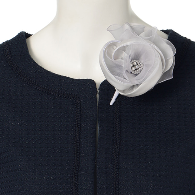 シルク素材のお花が上質な印象のコサージュ。 中心にパールやビジューをあしらい、とても繊細に花の美しさを表現。 クリップがついているのでジャケットのラペルや、ヘアーにもお使いいただけます。 上品な色味で、卒入園やブライダルゲストなどにぴったりのコサージュです。