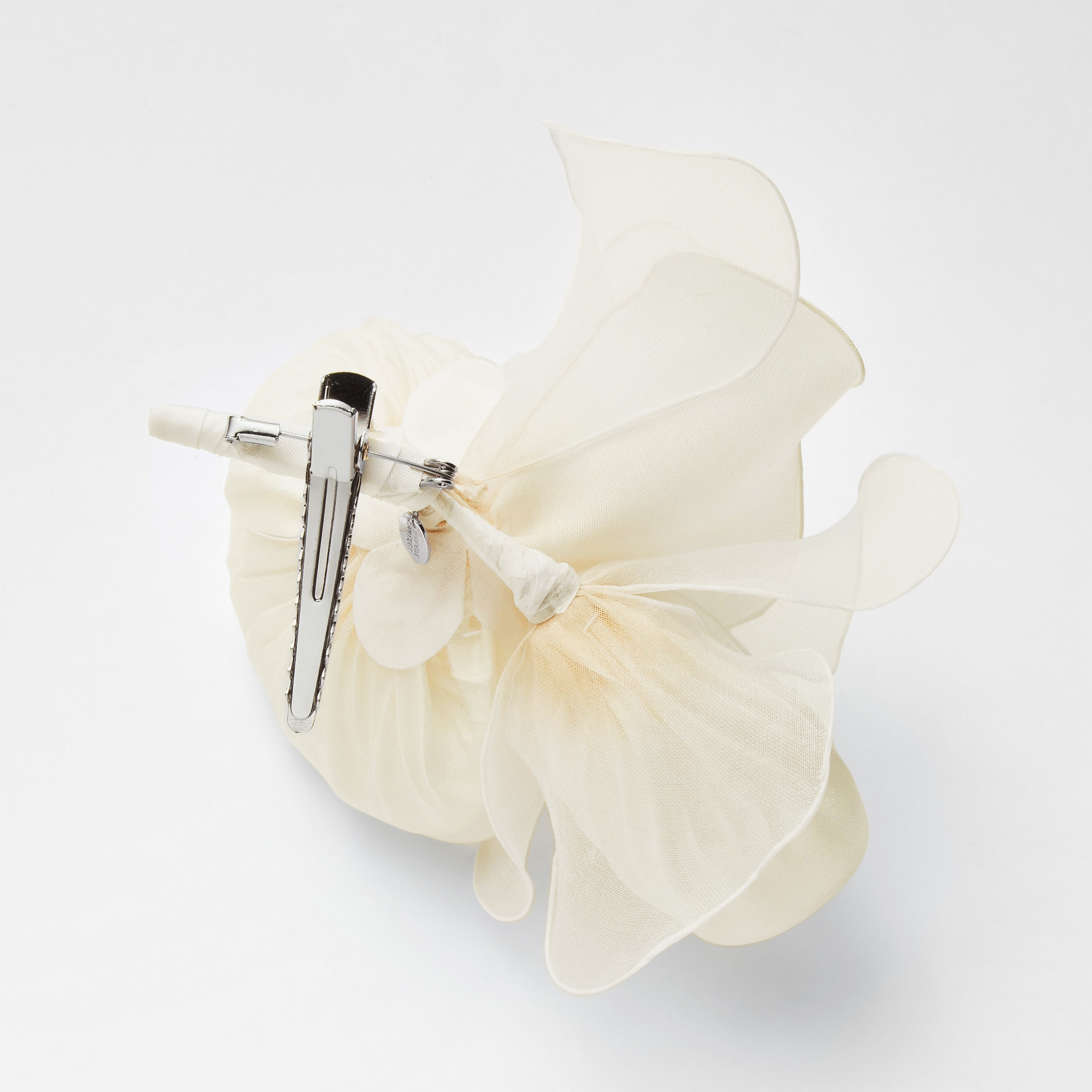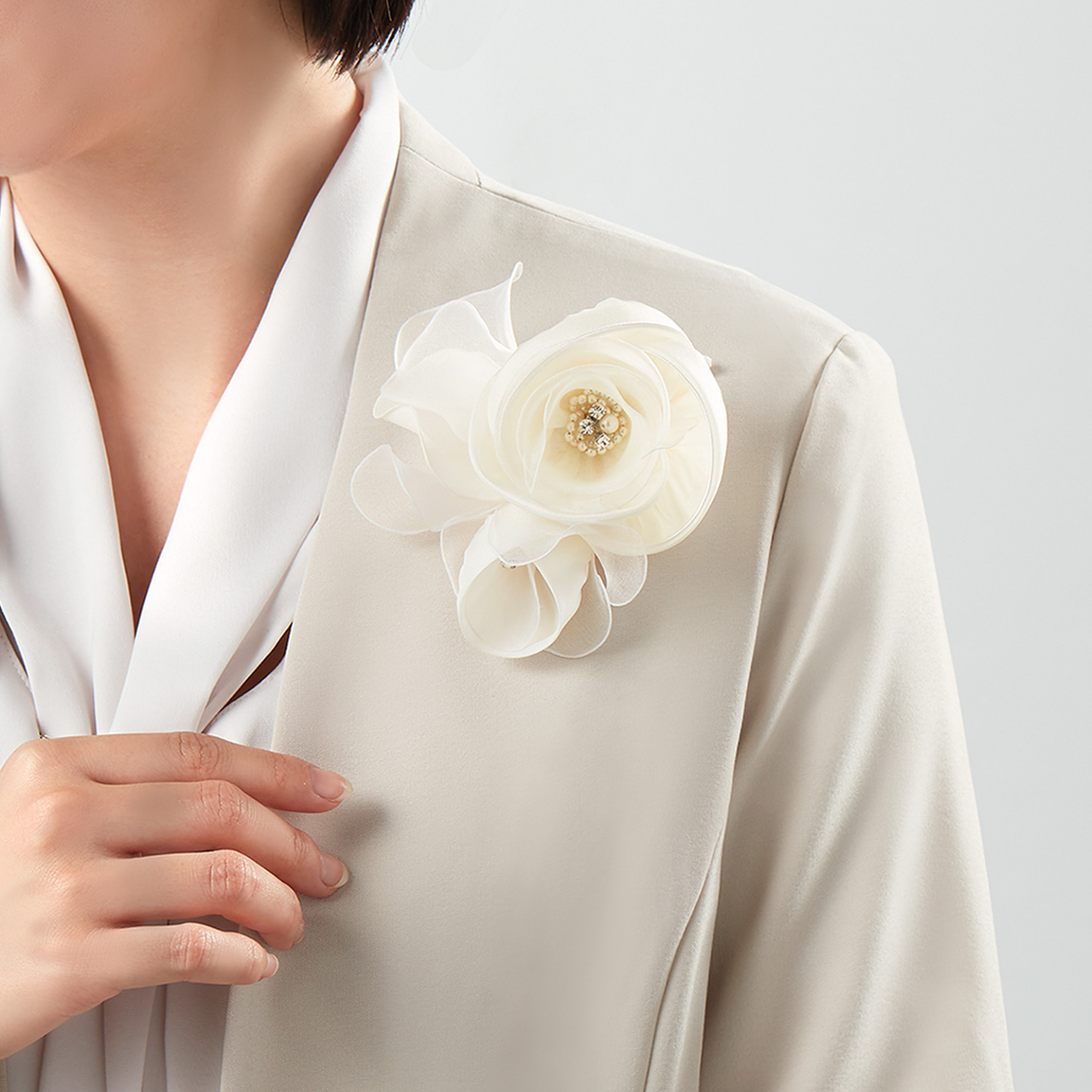 シルク素材のお花が上質な印象のコサージュ。 中心にパールやビジューをあしらい、繊細な花の美しさを表現。 クリップがついているのでジャケットのラペルや、ヘアーにもお使いいただけます。 上品な色味で、卒入園やブライダルゲストなどにぴったりのコサージュです。