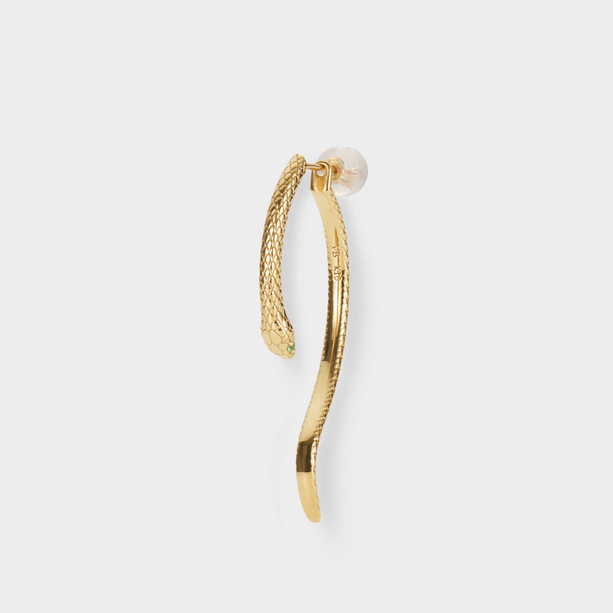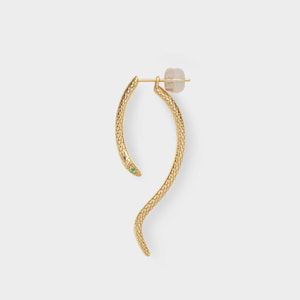 アオダイショウのしなやかなフォルムを繊細に表現したピアス。耳の後ろから覗く尾は滑らかで艶やかな曲線を描き、どの角度から見ても美しいデザインに仕上げました。