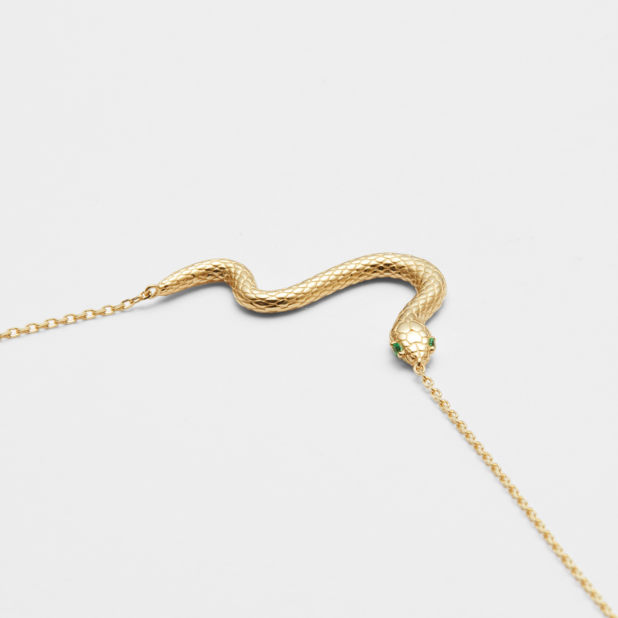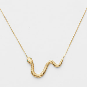 つぶらな瞳はエメラルドで表現。「幸運」や「喜び」の意味を持つエメラルドは「愛の象徴」とも言われ、ギフトにも最適です。アオダイショウの神秘的な美しさが際立つネックレスです。