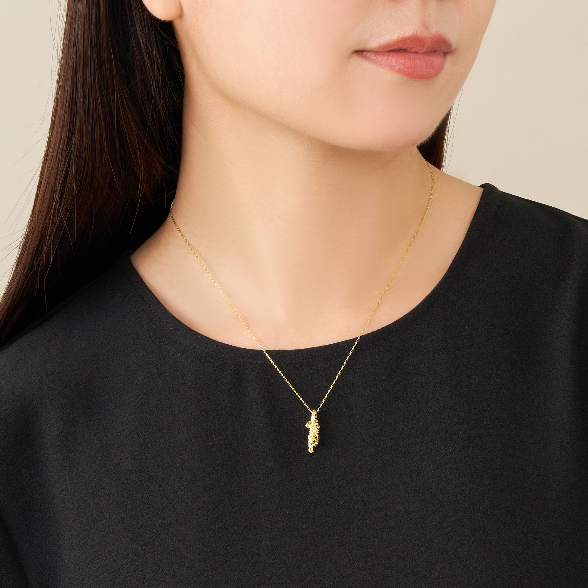 特徴的な斑点模様に、尻尾の先まで躍動感あるリアルな体の動きや、ふっくらとした毛並みまでディティールにこだわりました。縦長のフォルムで、胸元をすっきり美しく魅せてくれます。