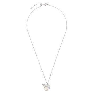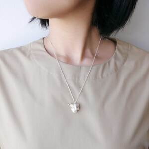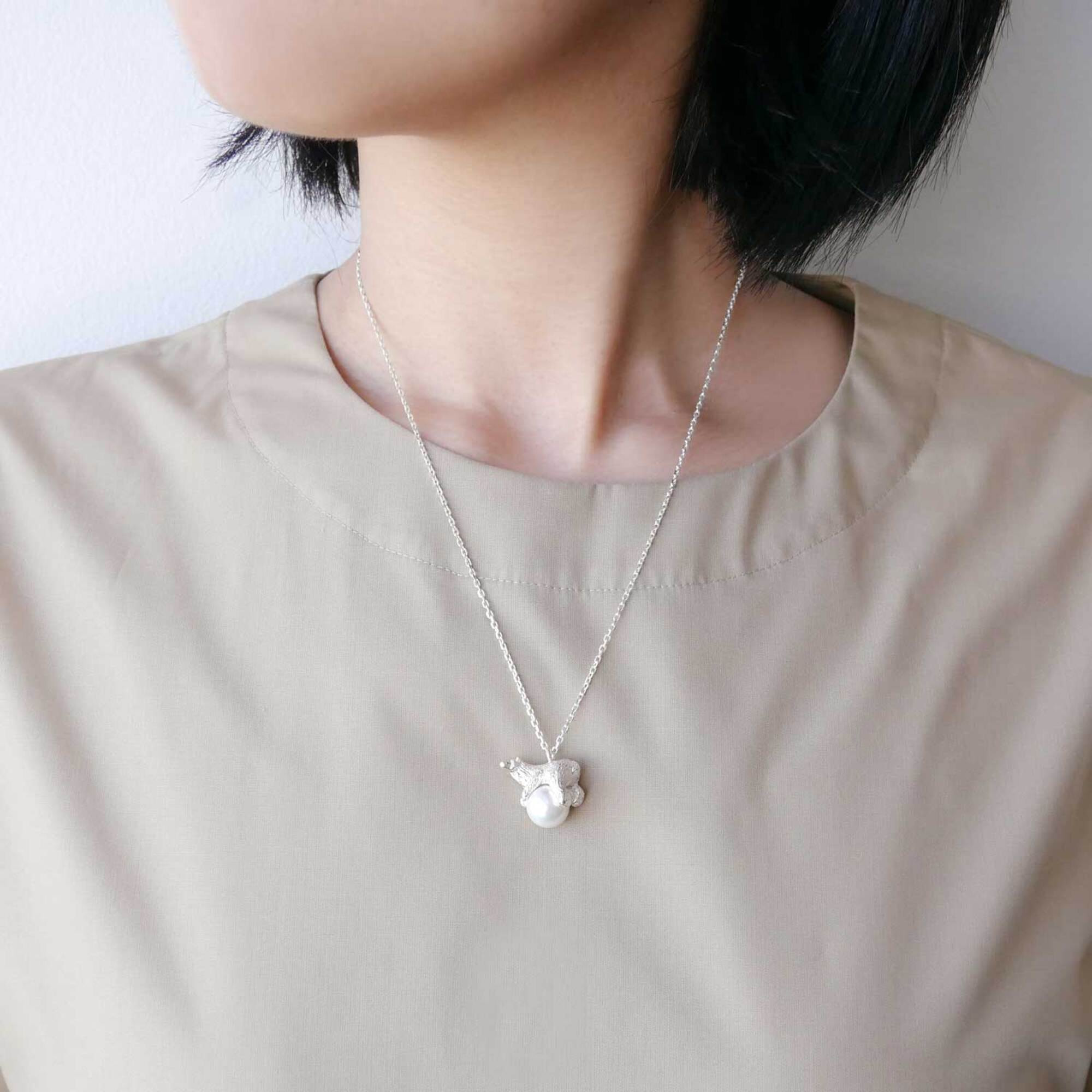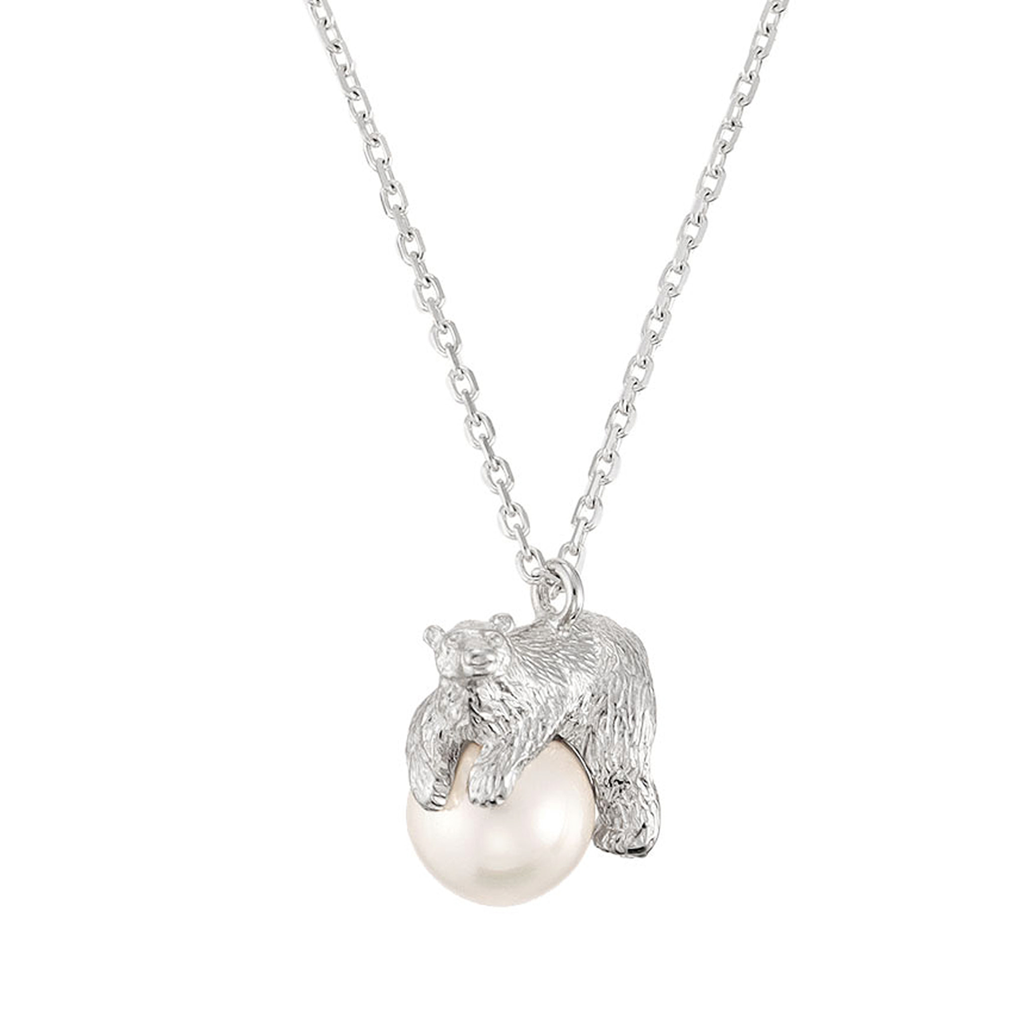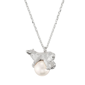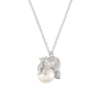 氷に見立てた大振りのパールの上で、ゆったりとくつろぐホッキョクグマのネックレス。