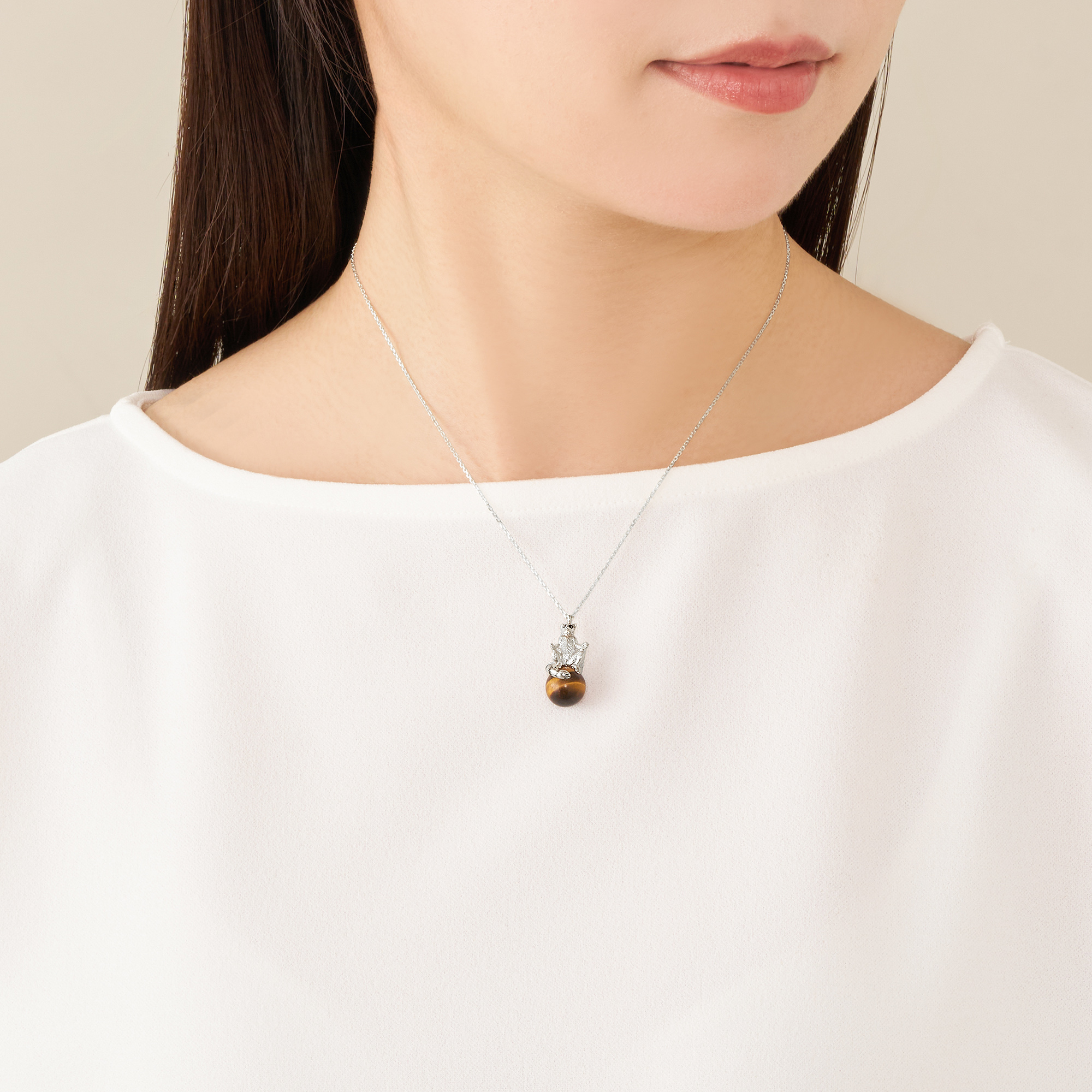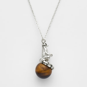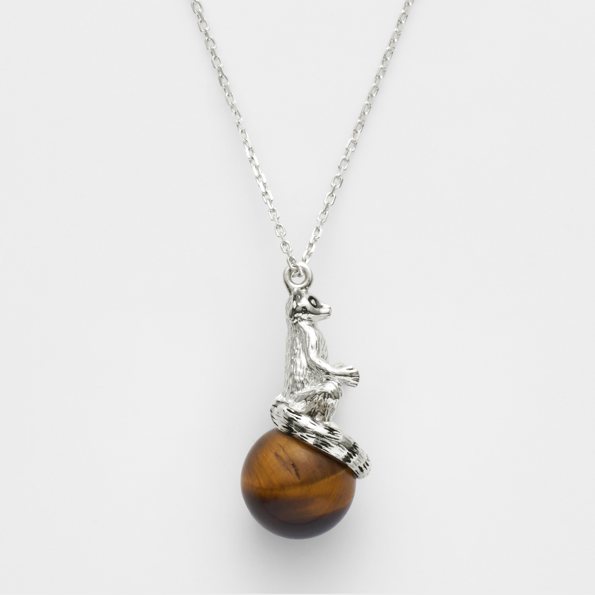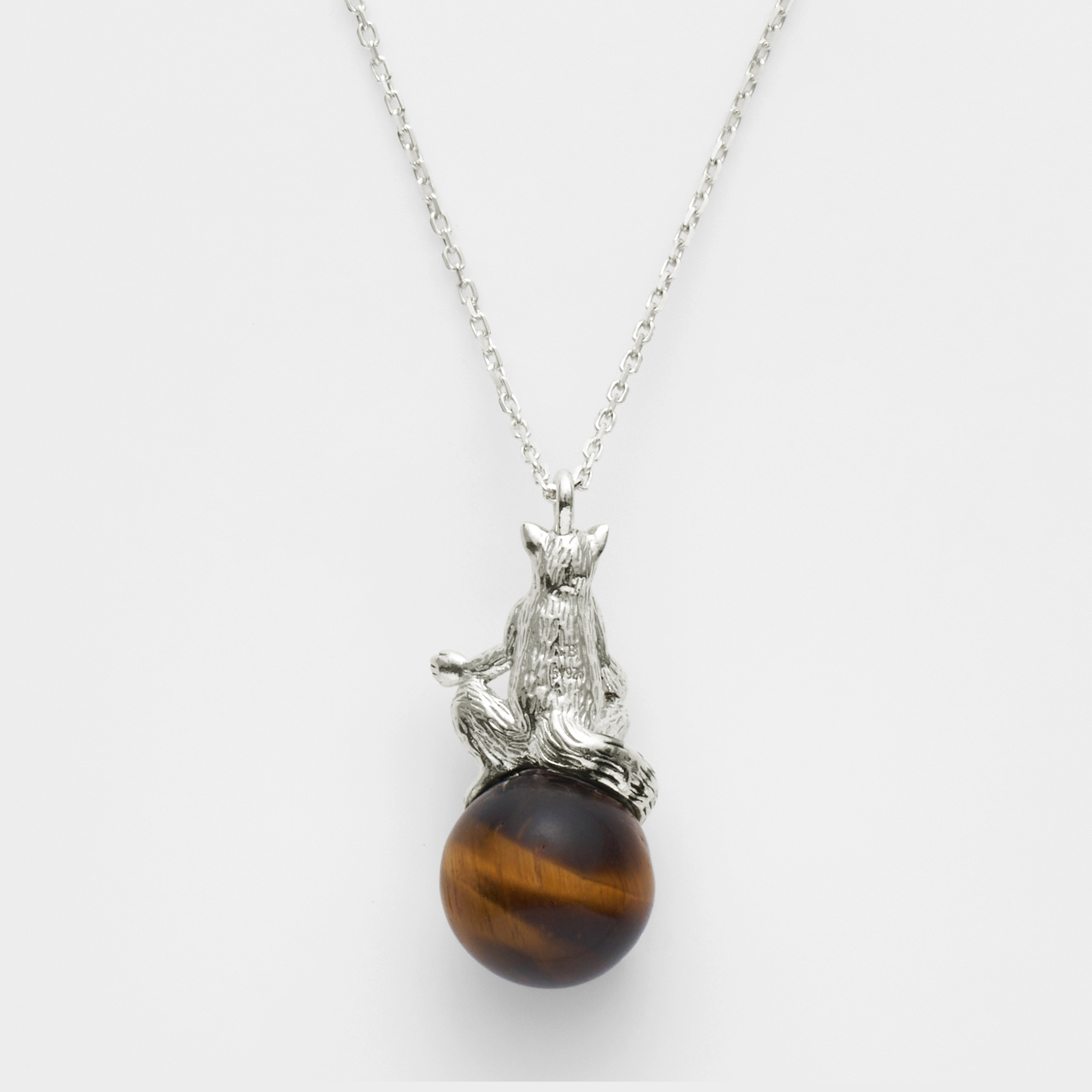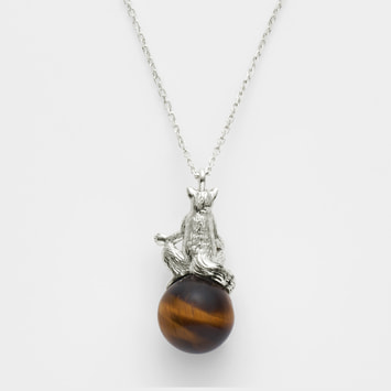 チャームポイントでもある尻尾の縞模様が、タイガーアイのニュアンスある模様とリンクした、完成度の高いデザインです。