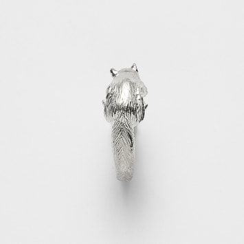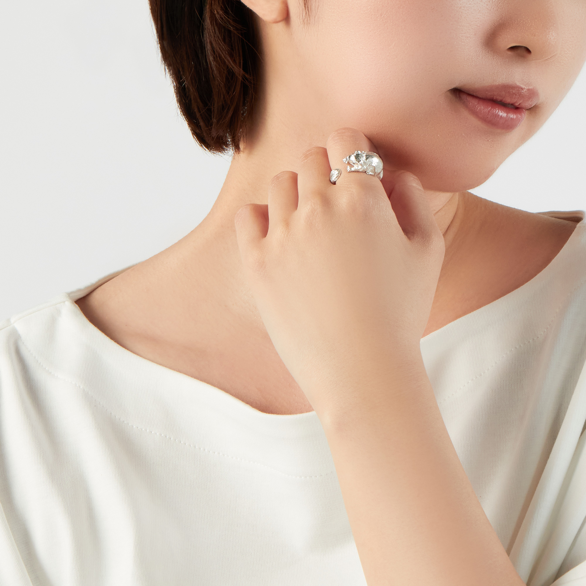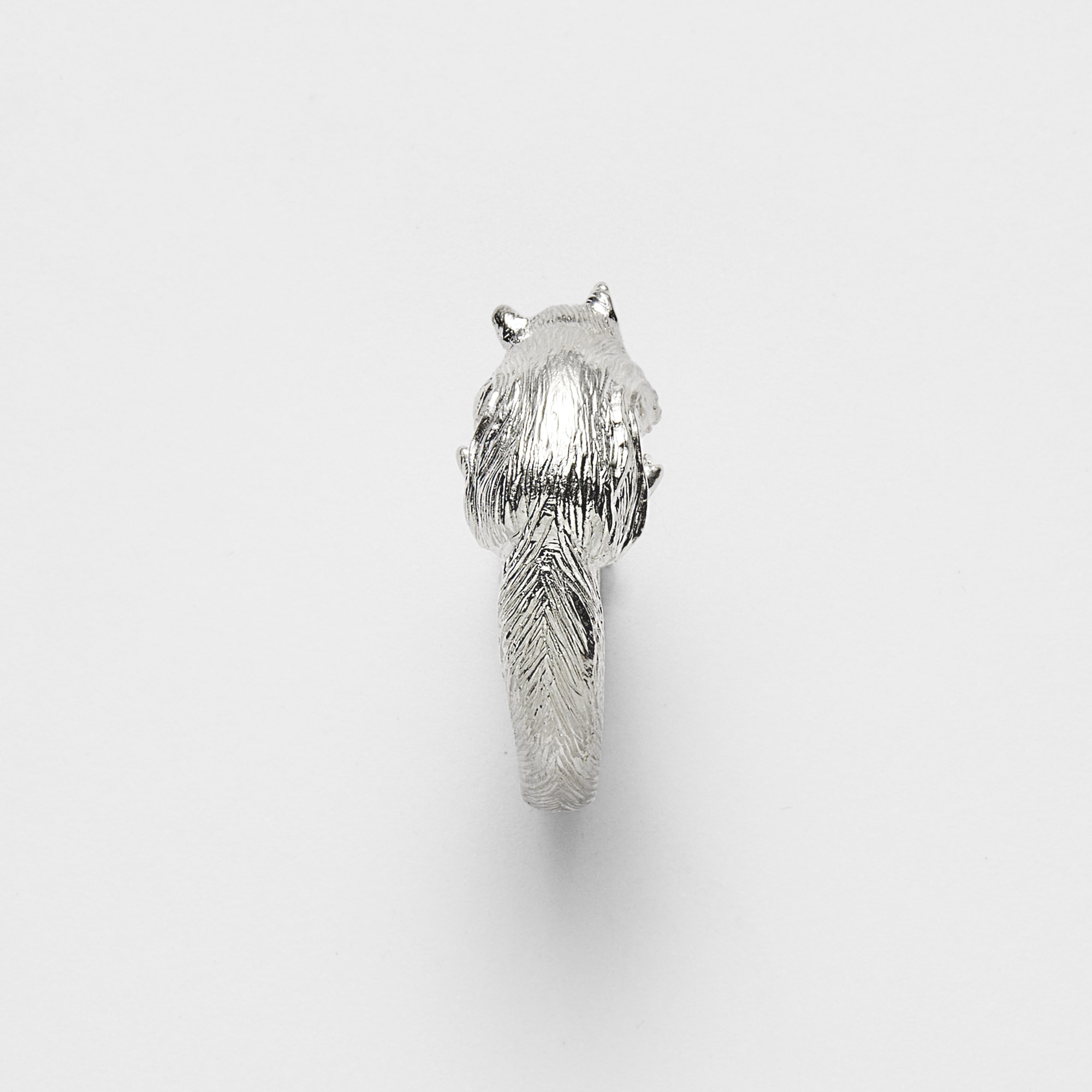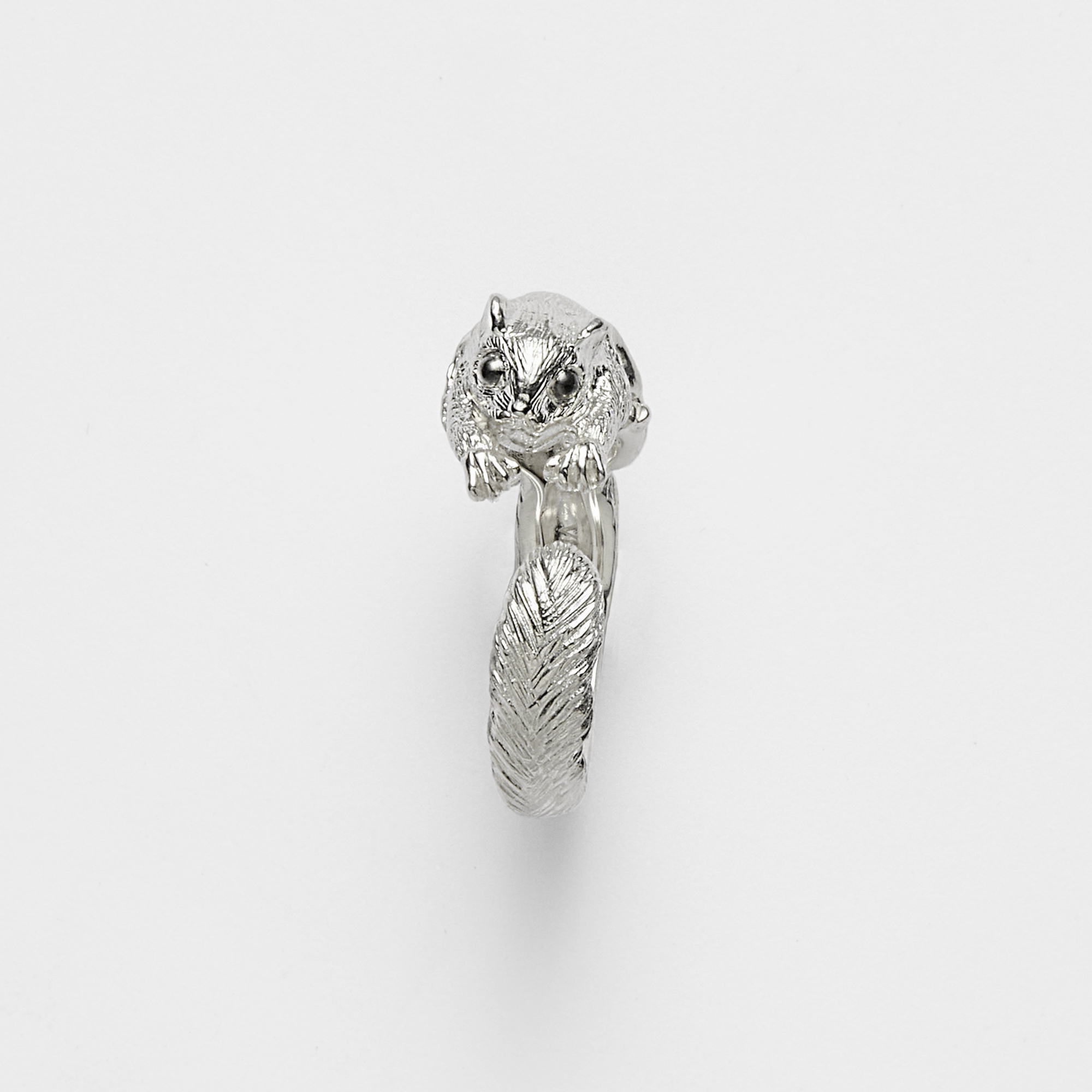 ふっくらとした毛並みに、うるうるとした瞳が印象的なエゾモモンガのリング。「森の妖精」とも呼ばれるエゾモモンガが、指にくるりと巻きつく姿は、愛らしさに思わず心奪われます。遊び心のあるデザインで、小さい中にも顔の表情や、リアルな体の動き、毛並みのディテールにまでこだわりました。見ているだけで幸せと癒しを与えくれる、毎日のお出かけに連れて行きたくなるアイテムです。