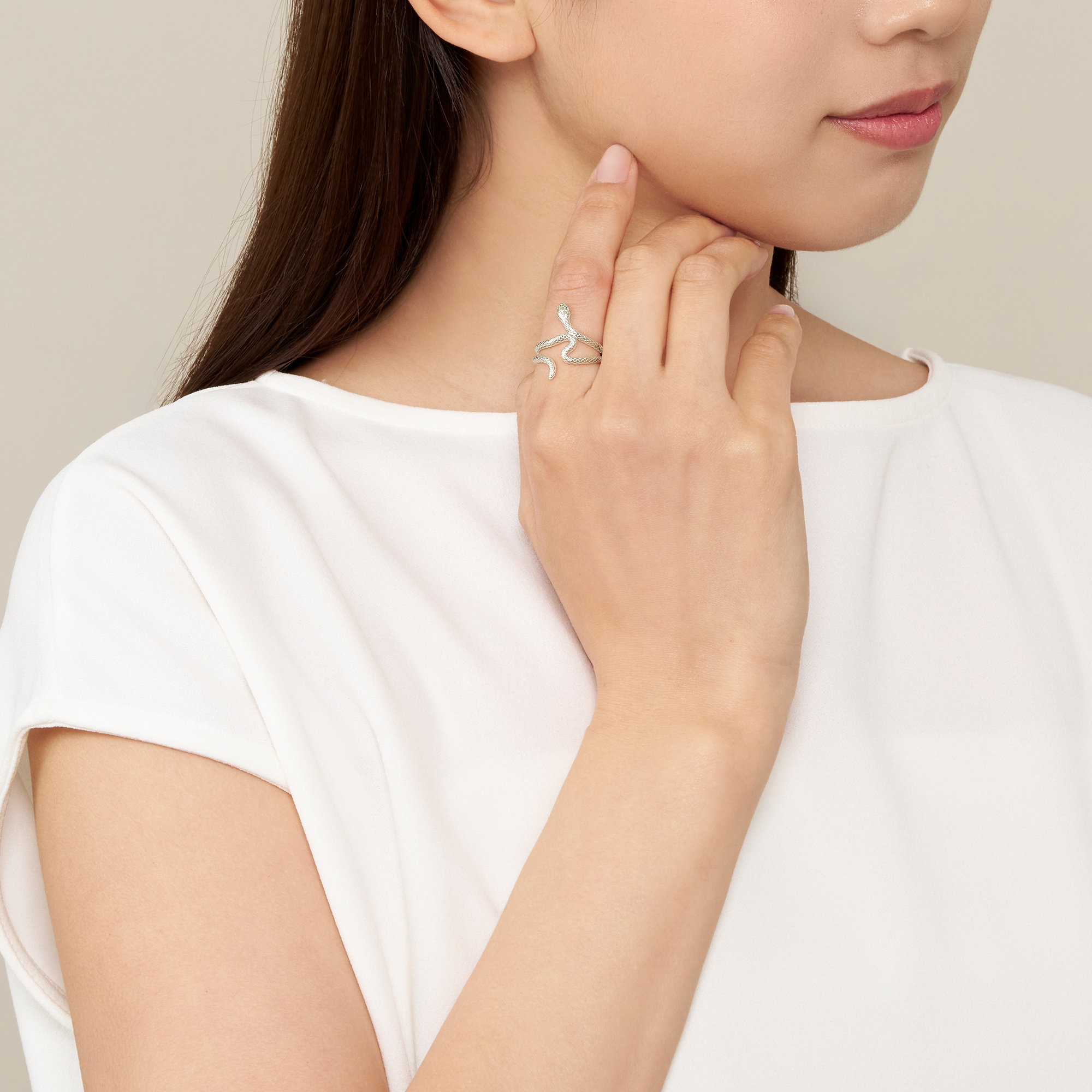 アオダイショウのしなやかなフォルムを表現したリング。柔らかな曲線が繊細に重なり合う程よく華やかなデザインで、指元を美しく魅力的にみせてくれます。