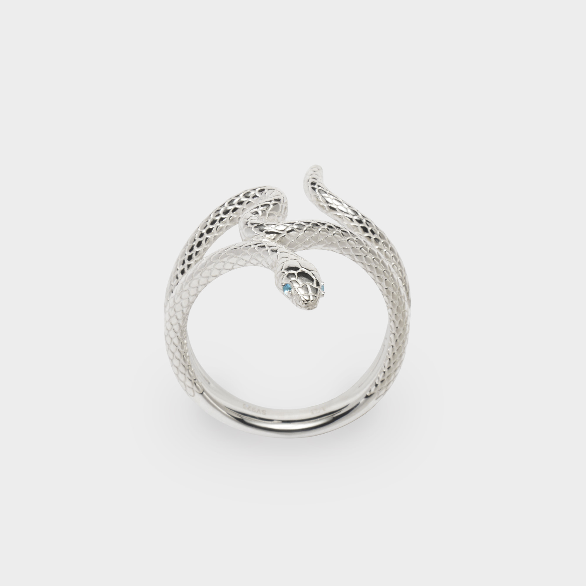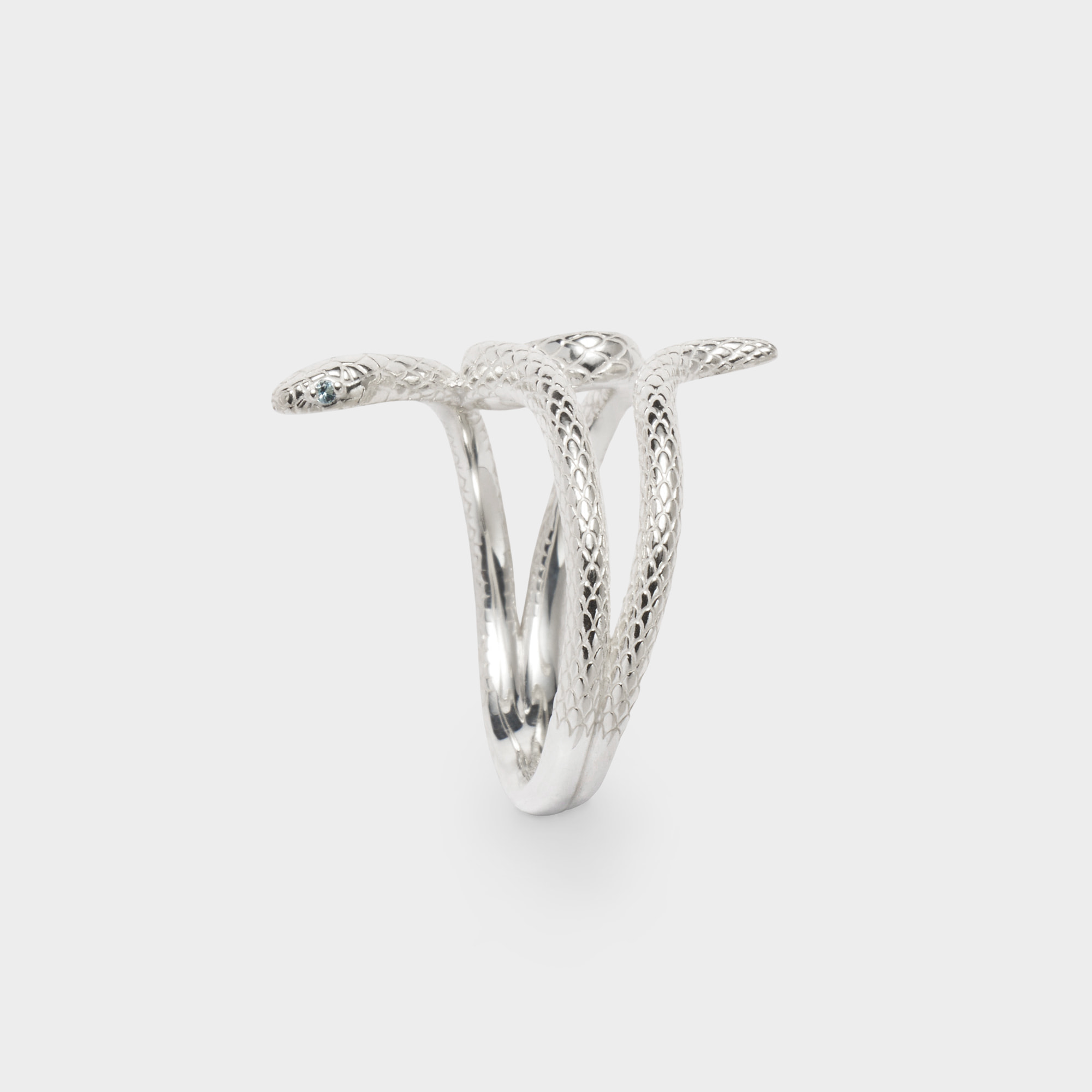 つぶらな瞳は涼やかなブルートパーズで表現しました。「希望」の意味を持つブルートパーズは、人生の転機を呼び込み、成功へ導く石とも言われ、自分へのお守りジュエリーやギフトにも最適です。アオダイショウの神秘的な美しさが際立つリングです。