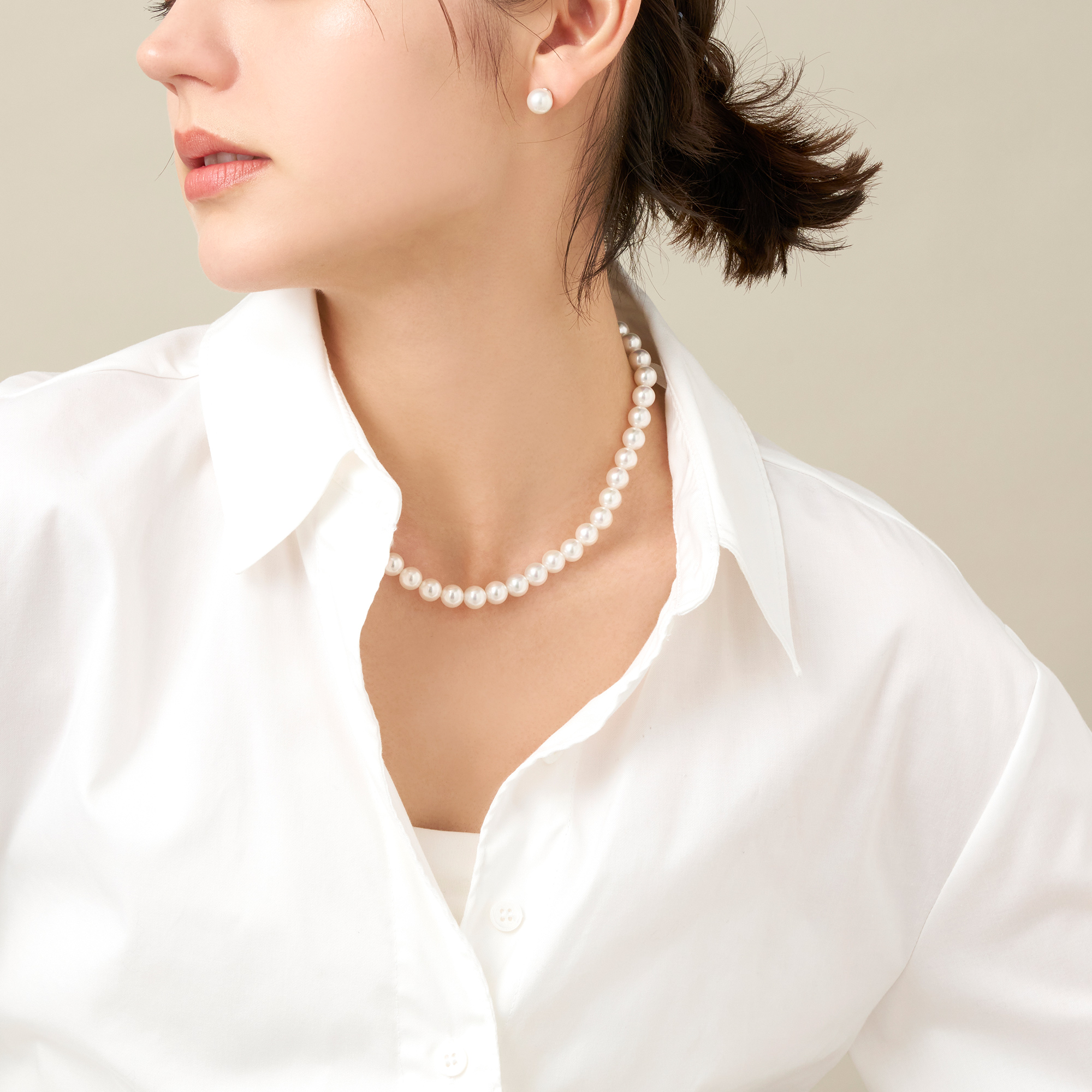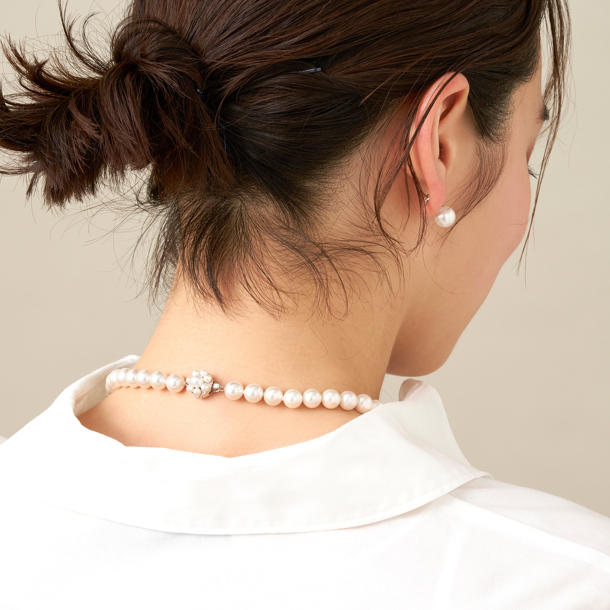 ネックレスは人気の8mm珠。ピアスはワンサイズアップの9mm珠をセット。ピアスをワンサイズ上げることでスタイルアップ効果があり、お洒落なパールスタイルを完成させます。フォーマルシーンはもちろん、ドレスアップ・デイリーにと、オールマイティーに活躍してくれます。