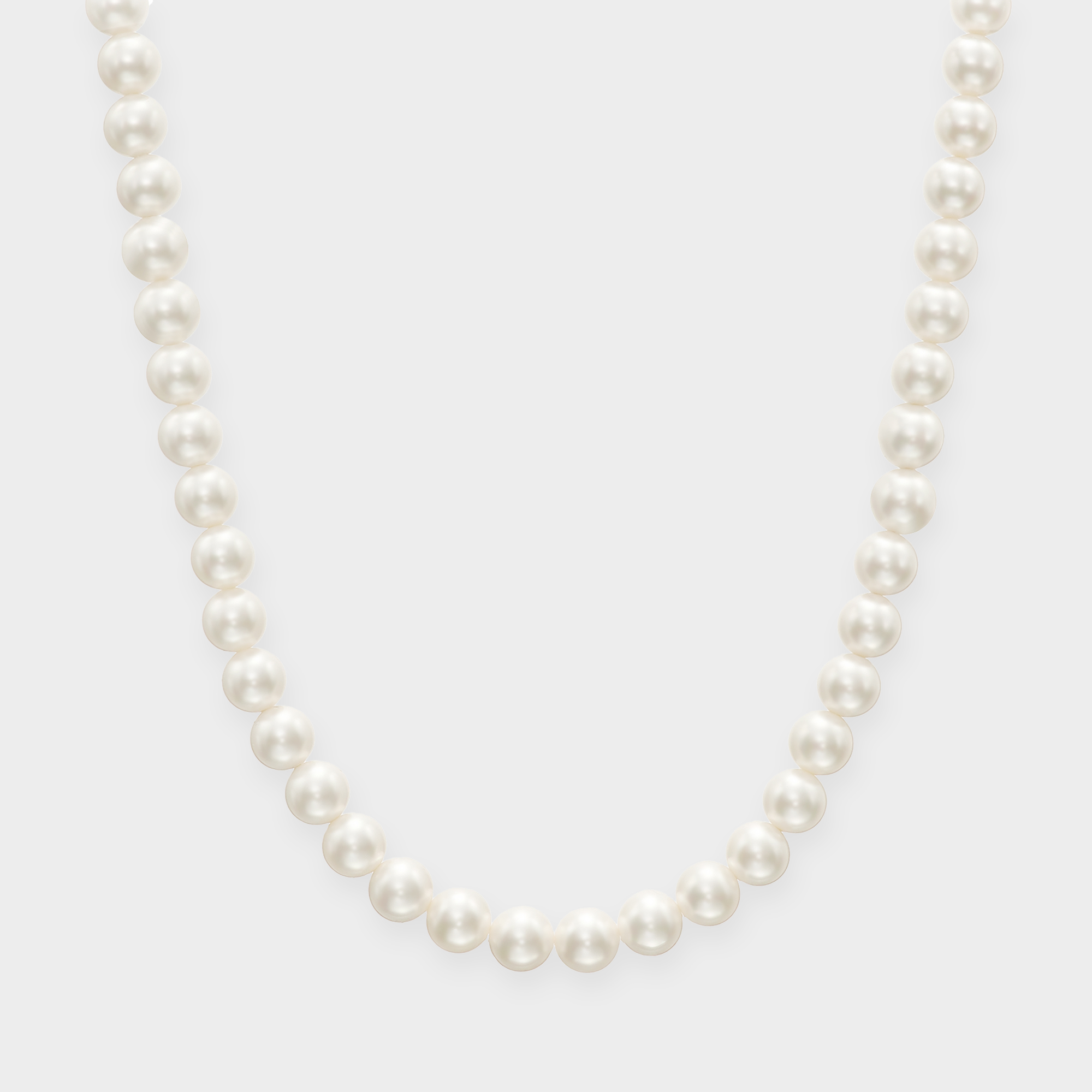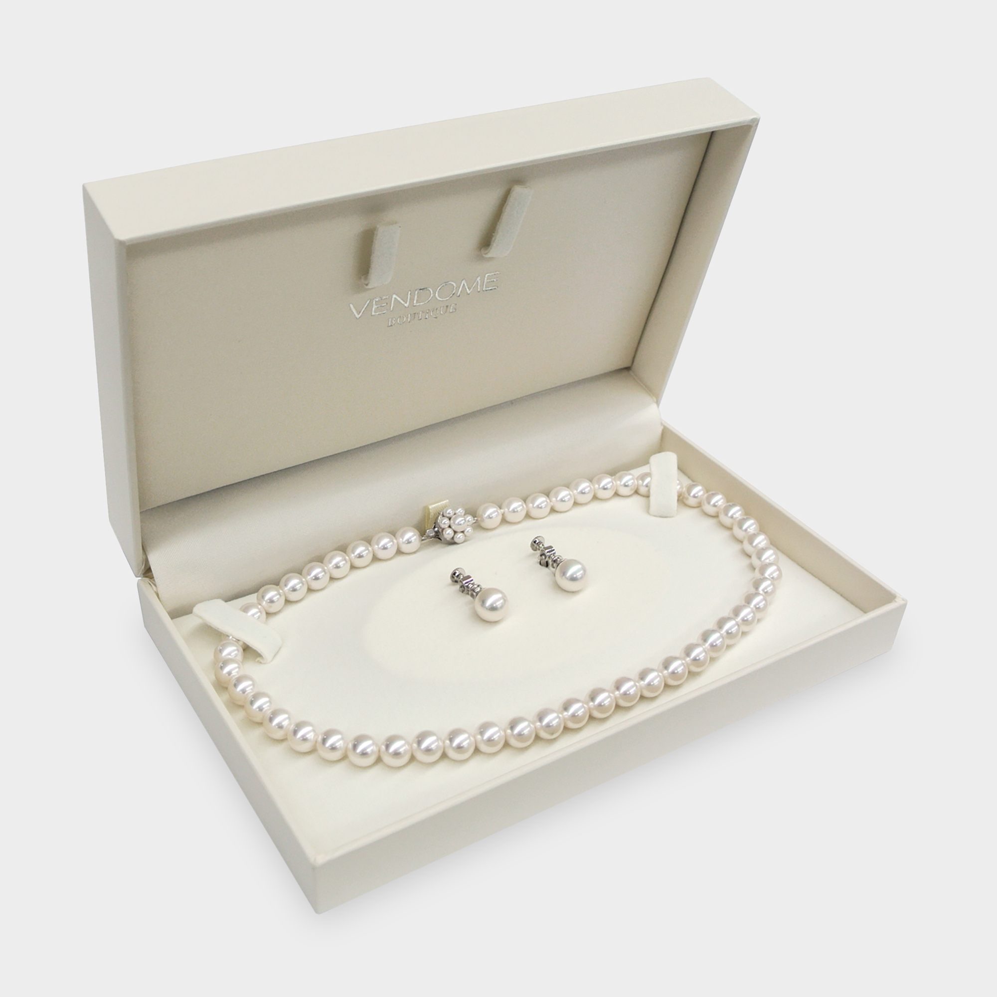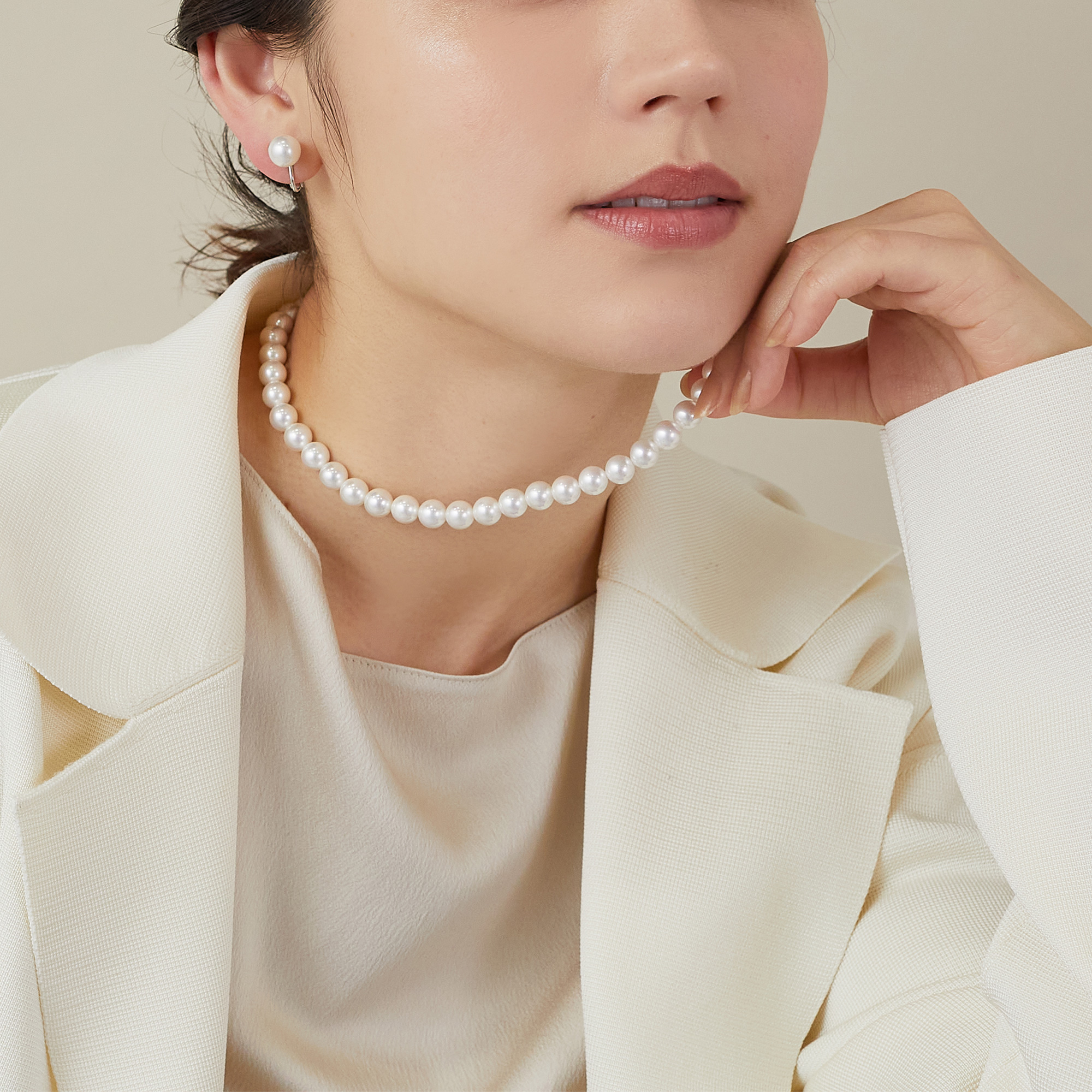 ネックレスは人気の8mm珠。イヤリングはワンサイズアップの9mm珠をセット。イヤリングをワンサイズ上げることでスタイルアップ効果があり、お洒落なパールスタイルを完成させます。フォーマルシーンはもちろん、ドレスアップ・デイリーにと、オールマイティーに活躍してくれます。