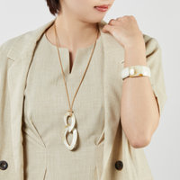 ナチュラルな雰囲気の水牛アクセサリーを、ジャケットに合わせて都会的な印象に。ボリュームのあるトップはグラデーションになっており、すっきりと見え洗練さが増します。ブレスレットは水牛を贅沢に使っていながら、ゴムの仕様で着脱しやすく高見えするアイテムです。