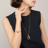 秋冬の落ち着いたカラーのトップスに、カーネリアンの深みのあるバーガンディーカラーのアクセサリーが華やかさをプラス。顔周りを明るく印象的にみせてくれます。お揃いのバングルは、素肌にはもちろん洋服の上からつけても程よいボリュームがあり存在感を放ちます。