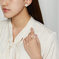 指に花を飾ったようなフォークリング。リング部分が見えないので花の可憐さが際立ちます。同じデザインのイヤーカフとコーディネートすると一層華やかに。春のスタイルに取り入れたいアイテムです。