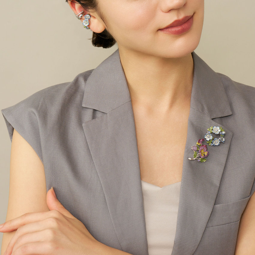 身に着けるだけでハッピーな気分になれるフラワーモチーフ。ネモフィラとパンジーのブローチはマニッシュなジレを華やかに彩り、顔周りがぐっと明るい印象に。ハンドペイントの優しいカラーのアイテムは、コーディネートがまとまりやすく、カジュアルなスタイルにもおすすめです。