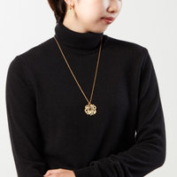 黒のトップスに大人っぽいマット仕上げのタイポグラフィのアイテムがクラシカルな雰囲気を演出。ネックレスにはキラキラと輝くミツバチがアクセントに。イヤリング・ピアスはモチーフの取り外しができシンプルなフープとしても使えコーディネートの幅が広がります。